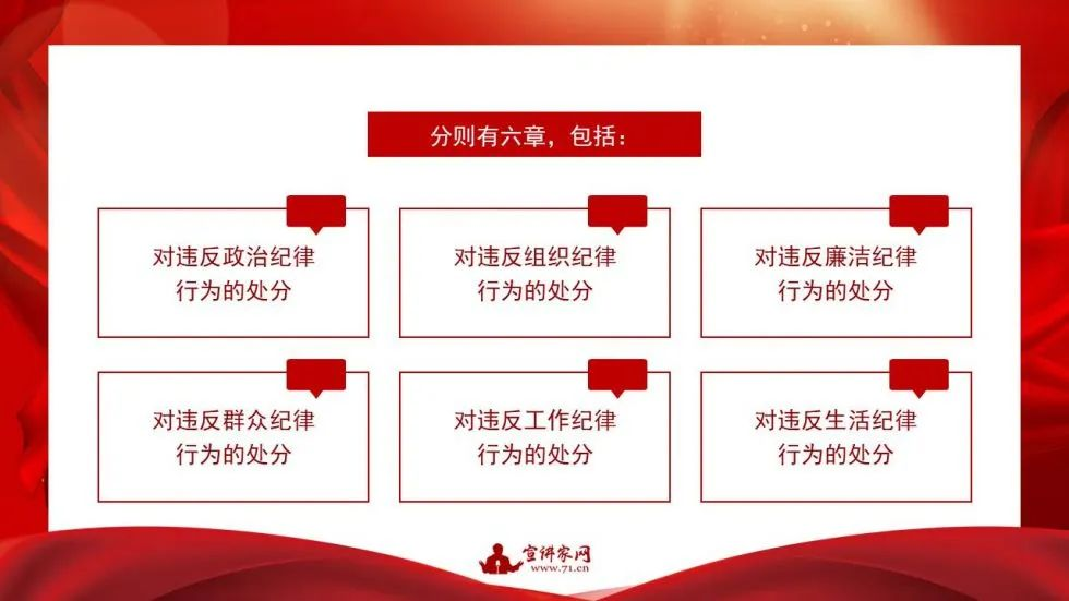《中国共产党纪律处分条例》的分则部分是从第四十九条到第一百五十四条,共六章,包括对违反“政治纪律、组织纪律、廉洁纪律、群众纪律、工作纪律、生活纪律”行为的处分。《中国共产党纪律处分条例》附则有四条,从第一百五十五条到第一百五十八条。