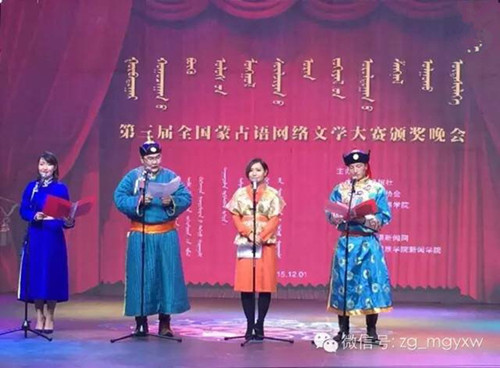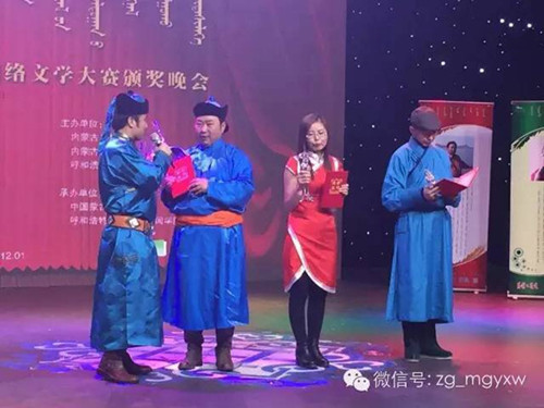 颁奖仪式现场还开通了中国蒙古语网络文学和中国蒙古语报告文学发布平台,并宣布了“迎接自治区成立70周年第四届全国蒙古语网络文学大赛”征稿活动从2015年12月1日开始,至2017年5月1日结束的信息。