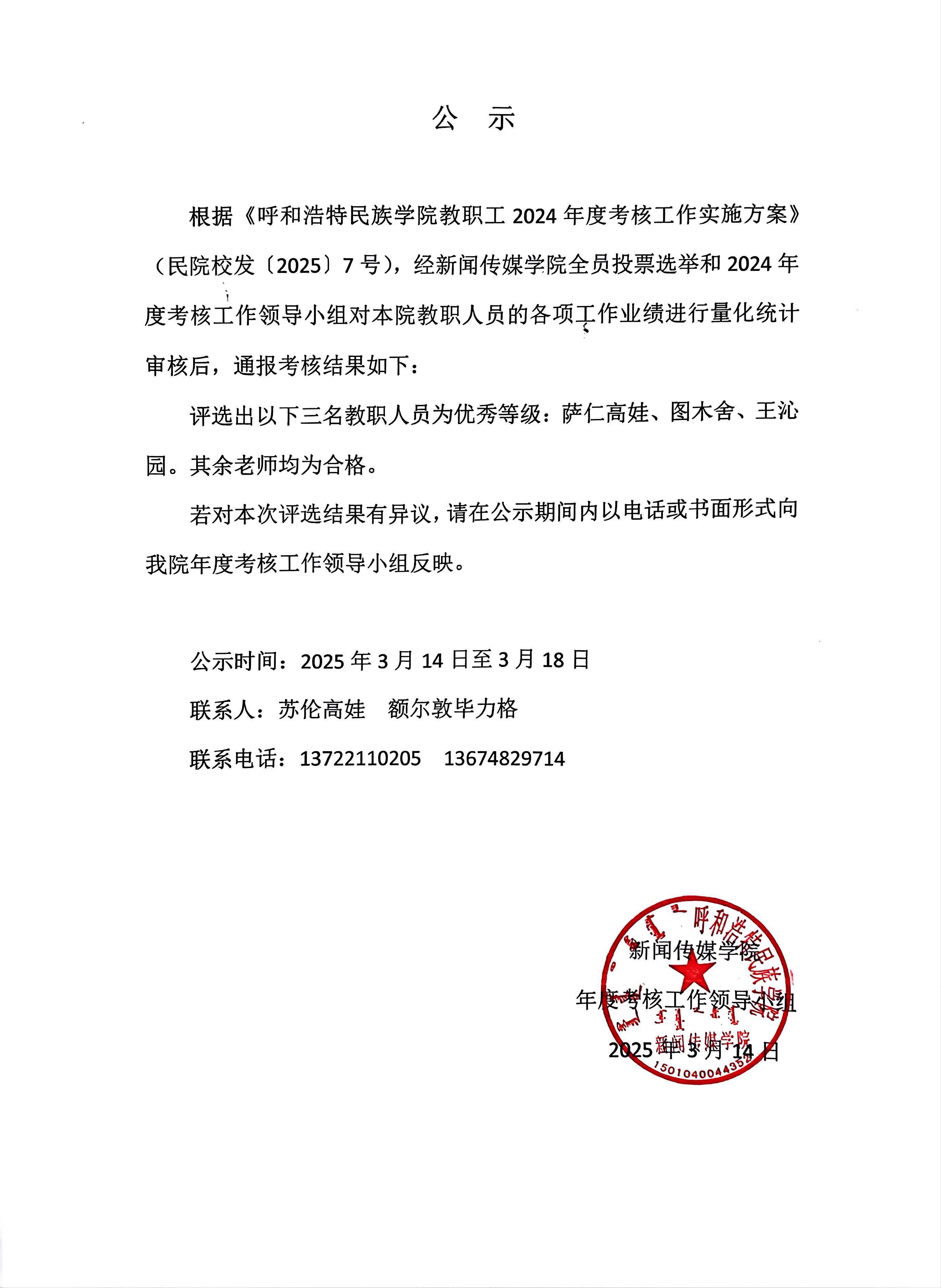 关于新闻传媒学院2024年度教职工考核结果的公示