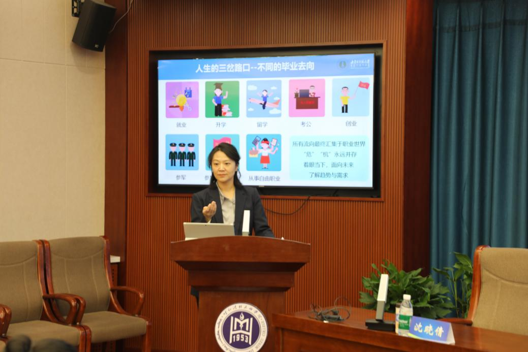 沈晓倩老师围绕个人发展道路、就业形势解读以及学校资源支持三方面向同学们进行了详细讲解。通过数据图表与相关案例,直观呈现了当前就业市场的供需状况、热门行业发展趋势以及不同职业选择带来的机遇和挑战,让同学们对就业环境有了全面、深入的了解。
