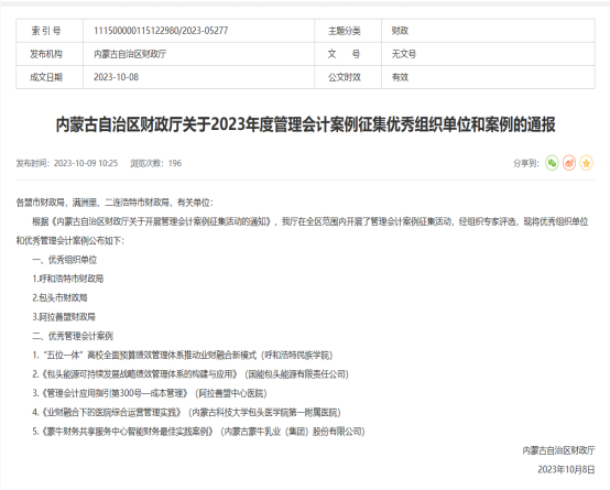 由内蒙古自治区财政厅开展的管理会计案例征集活动的结果日前揭晓,best365财务处副处长徐多申报的案例《“五位一体”高校全面预算绩效管理体系推动业财融合新模式》,入选优秀管理会计案例,并位列第一。
