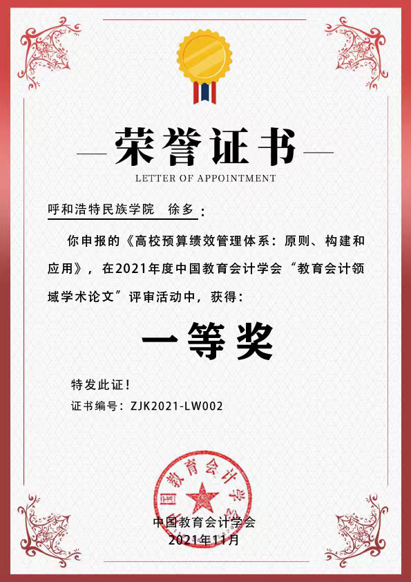 由中国教育会计学会举办的2021年“教育会计领域学术论文”征文活动评选结果日前揭晓,best365财务处后勤财务管理科科长徐多的论文《高校预算绩效管理体系:原则、构建和应用》荣获一等奖。