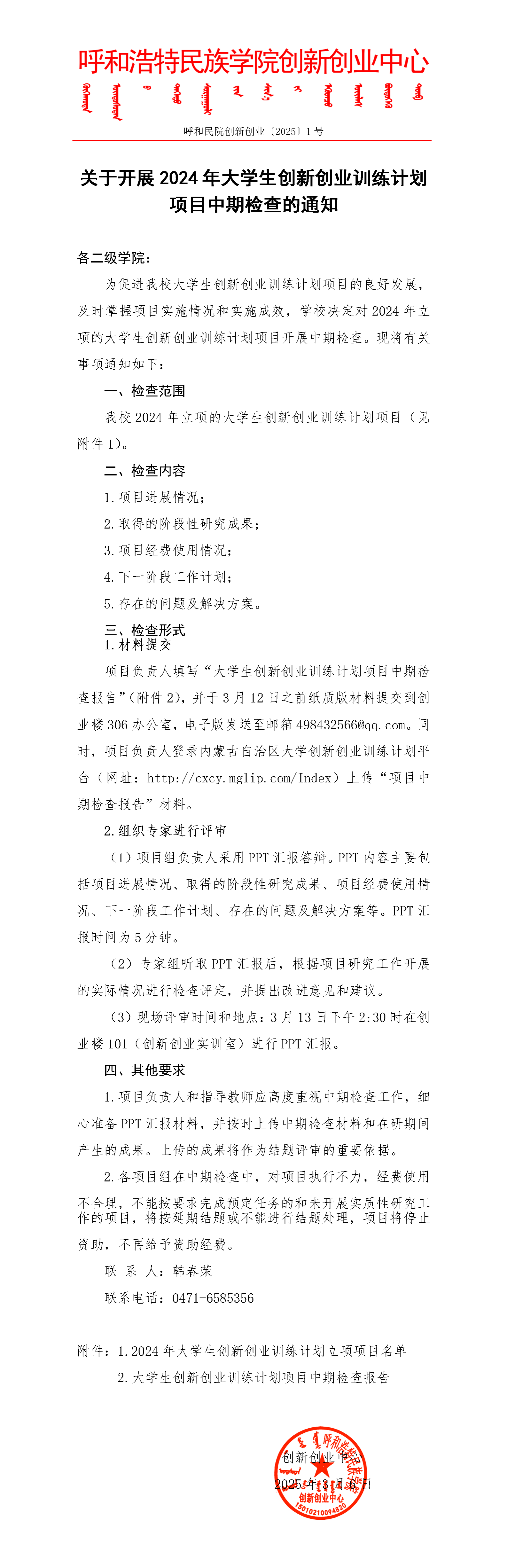 关于开展2024年大学生创新创业训练计划项目中期检查的通知