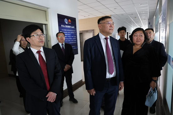 签约仪式结束后,访问团一行先后参观了学校校史馆、体育学院、美术学院、音乐学院、以及华为云学院鲲鹏中心、“可信大数据与人工智能”院士专家工作站,并到蒙古学学院、文学院、学前教育学院、法学院、数学科学学院进行了实地调研。