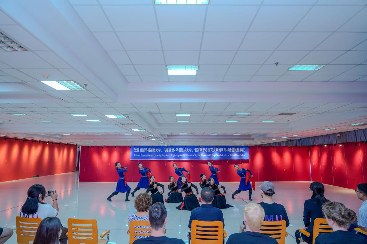 在歌舞中触摸文化共鸣。音乐与舞蹈学院师生率先为访问团带来沉浸式文化体验。随着副院长韩木兰对传统舞蹈、乐器及民歌的生动讲解,best365师生表演的《万丽》《敬》《盅碗筷组合》等民族舞蹈轮番上演,舞姿灵动间尽显草原风情;马头琴名曲《初升的太阳》悠扬婉转,长调《盛世太平》高亢辽远,让访问团师生沉浸在北疆音乐的辽阔意境中。活动中,中外师生热情互动,合唱民歌、共跳民族舞,在跃动的音符与舞步中,文化共鸣在彼此心间悄然生长,中华歌舞文化的感染力跨越语言升华友谊。