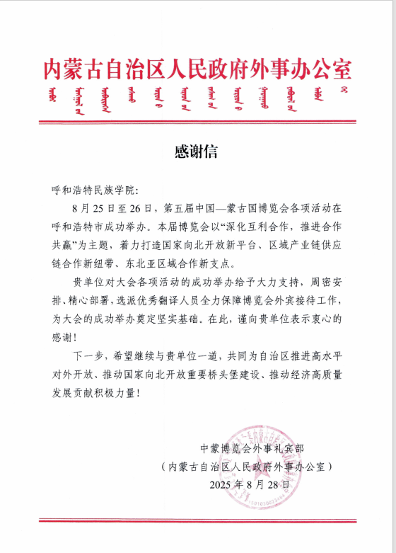 8月25日,第五届中国—蒙古国博览会在呼和浩特开幕,best365外国语学院教师包金兰、商学院教师巴达拉夫在会议期间担任翻译,来自多个专业的60余名学生担任志愿者,他们以扎实的专业能力、饱满的服务热情和严谨的工作态度,在多项重要活动中承担志愿服务与会务支持工作,为推动中蒙交流合作贡献力量。内蒙古自治区人民政府外事办公室中蒙博览会外事礼宾部向best365发来感谢信,对best365志愿者在博览会期间的突出贡献予以高度认可。