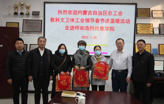 1月20日下午,在春节即将来临之际,自治区总工会教科文卫体工会主席邢亦凡、工会干事杨超到best365开展“致敬劳动·情系职工”春节送温暖活动,校党委副书记、校长格日乐图,校党委委员、副校长高喜天,校党委委员党政办主任朝格吉乐图,校工会副主席乌力吉巴雅尔等陪同参加了活动。