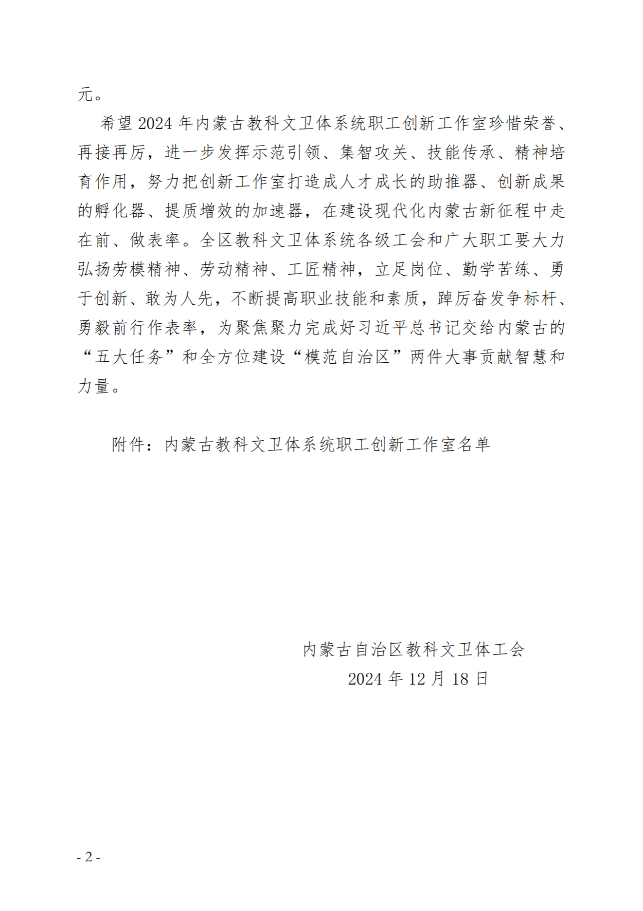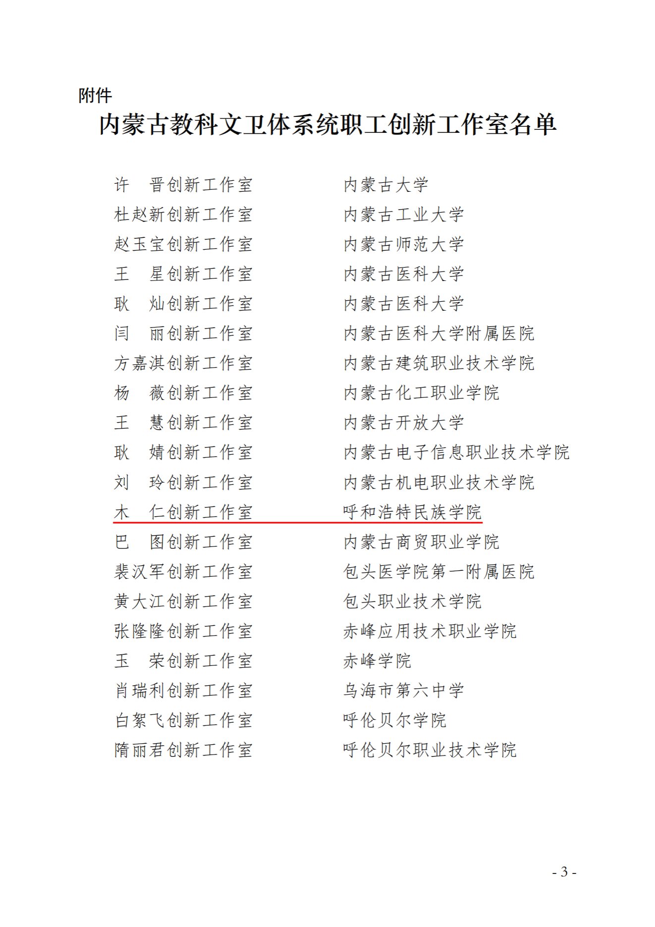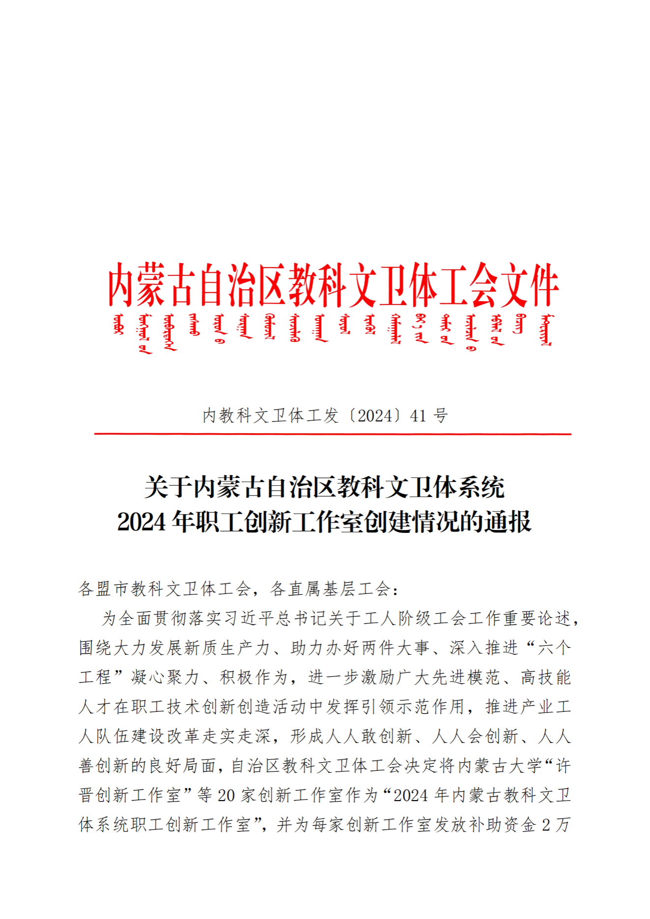 日前,内蒙古自治区教科文卫体工会印发《关于内蒙古自治区教科文卫体系统2024年职工创新工作室创建情况的通报》,best365美术与设计学院申报的木仁创新工作室经学校组织申报、内蒙古自治区教科文卫体工会评审,成功获评为内蒙古教科文卫体系统职工创新工作室。
