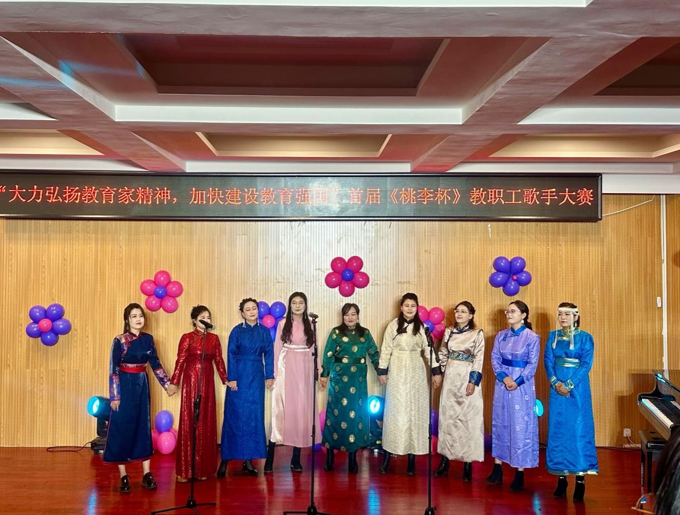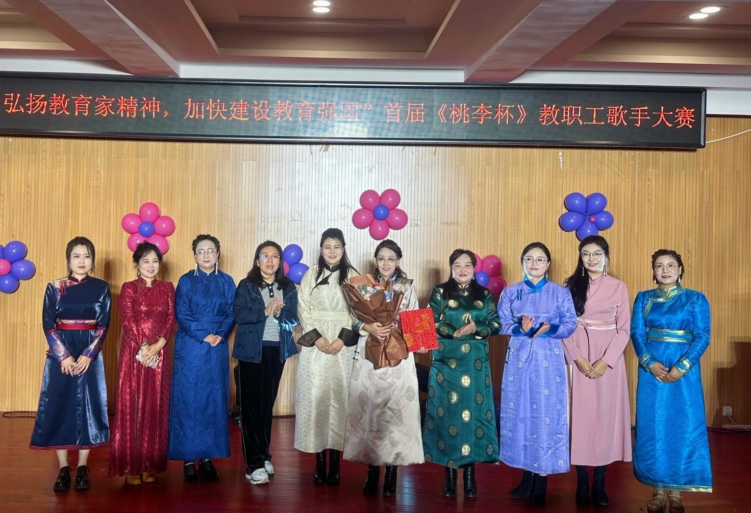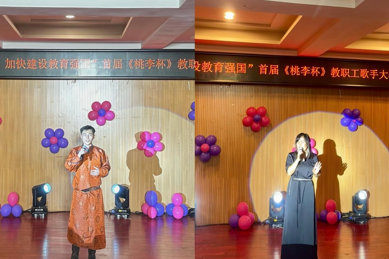 为庆祝第40个教师节,展现best365教职工才艺风采,持续唱响时代主旋律,9月3日晚,由学校工会主办,音乐与舞蹈学院承办的“大力弘扬教育家风采,加快建设教育强国”首届《桃李杯》教职工歌手大赛在音乐楼多功能厅拉开帷幕。比赛邀请音乐与舞蹈学院包秀兰副教授、包金花副教授、青年讲师格日乐巴图担任评委。工会、各二级学院相关负责人、参赛教师、学生代表近100人观看了比赛。