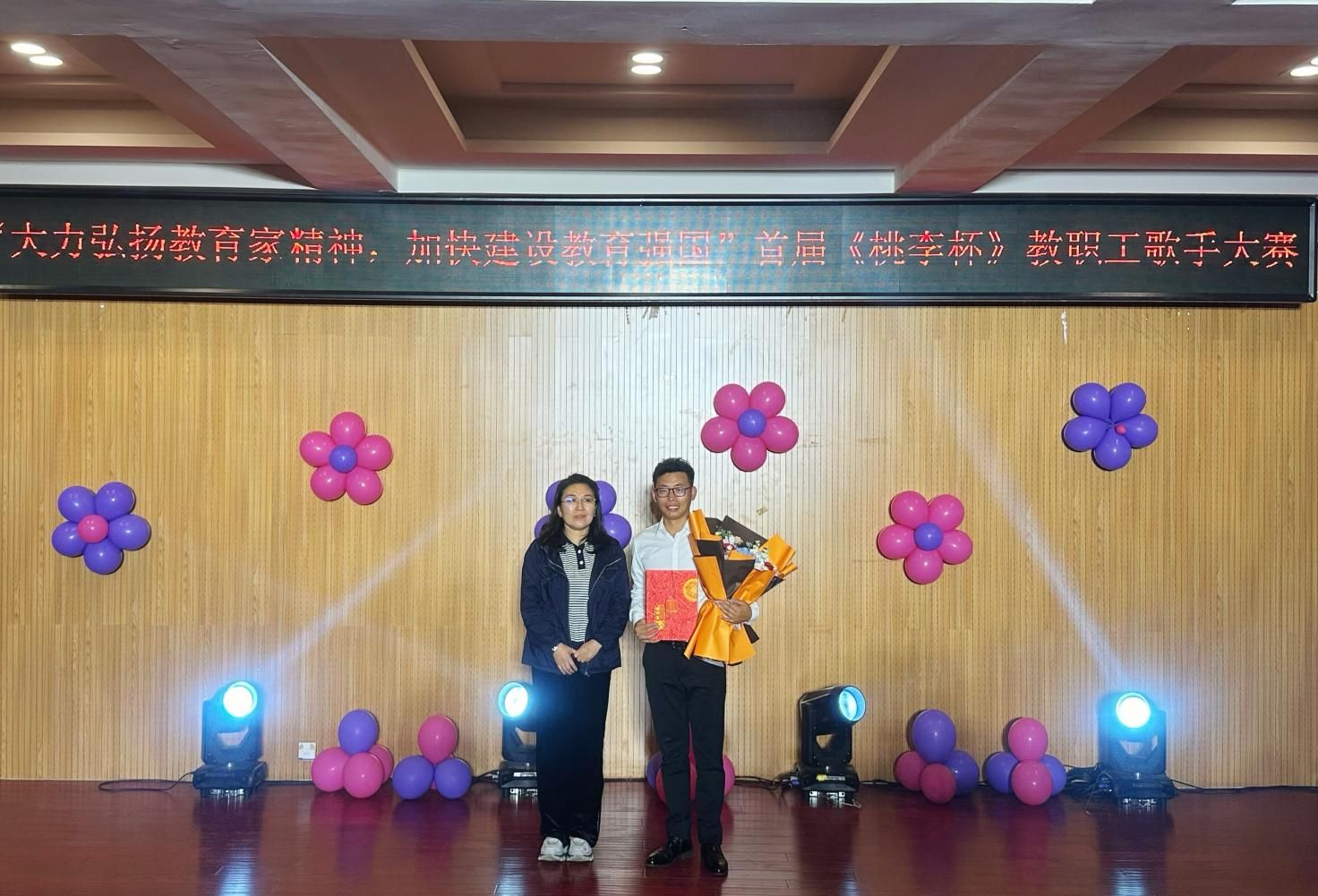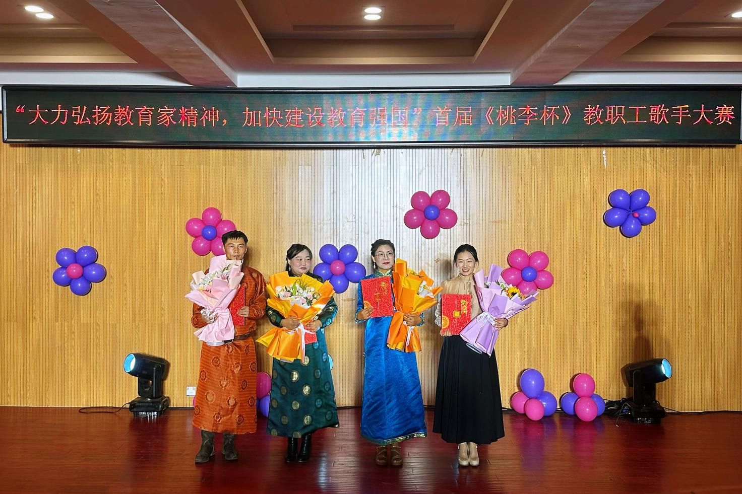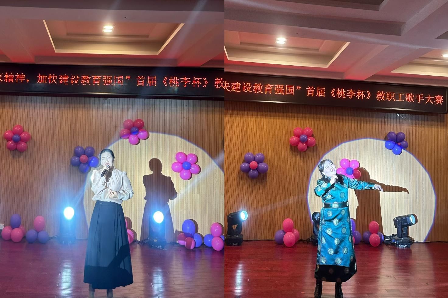 为庆祝第40个教师节,展现best365教职工才艺风采,持续唱响时代主旋律,9月3日晚,由学校工会主办,音乐与舞蹈学院承办的“大力弘扬教育家风采,加快建设教育强国”首届《桃李杯》教职工歌手大赛在音乐楼多功能厅拉开帷幕。比赛邀请音乐与舞蹈学院包秀兰副教授、包金花副教授、青年讲师格日乐巴图担任评委。工会、各二级学院相关负责人、参赛教师、学生代表近100人观看了比赛。