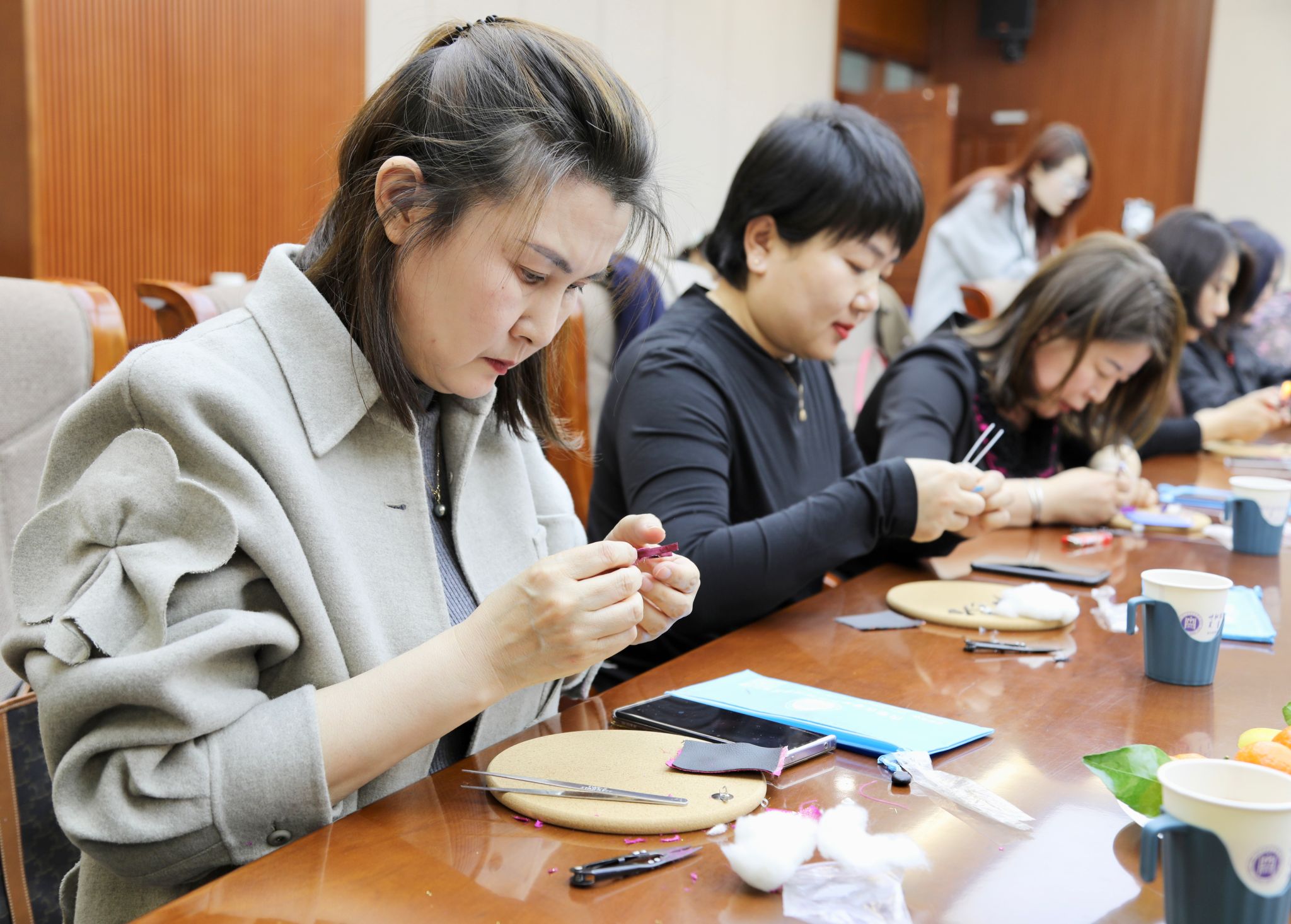 活动伊始,非遗手工盘扣传承大师刘瑞红为大家详细介绍了盘扣的历史渊源、文化内涵和制作方法。盘扣作为中国传统服饰的重要元素,承载着丰富的历史文化信息,是中华民族智慧的结晶。刘瑞红通过实物展示和现场演示,生动地向大家展示了盘扣从一根丝线到精美饰品的制作过程,让女教职工们对盘扣这一非遗技艺有了更深入的了解。