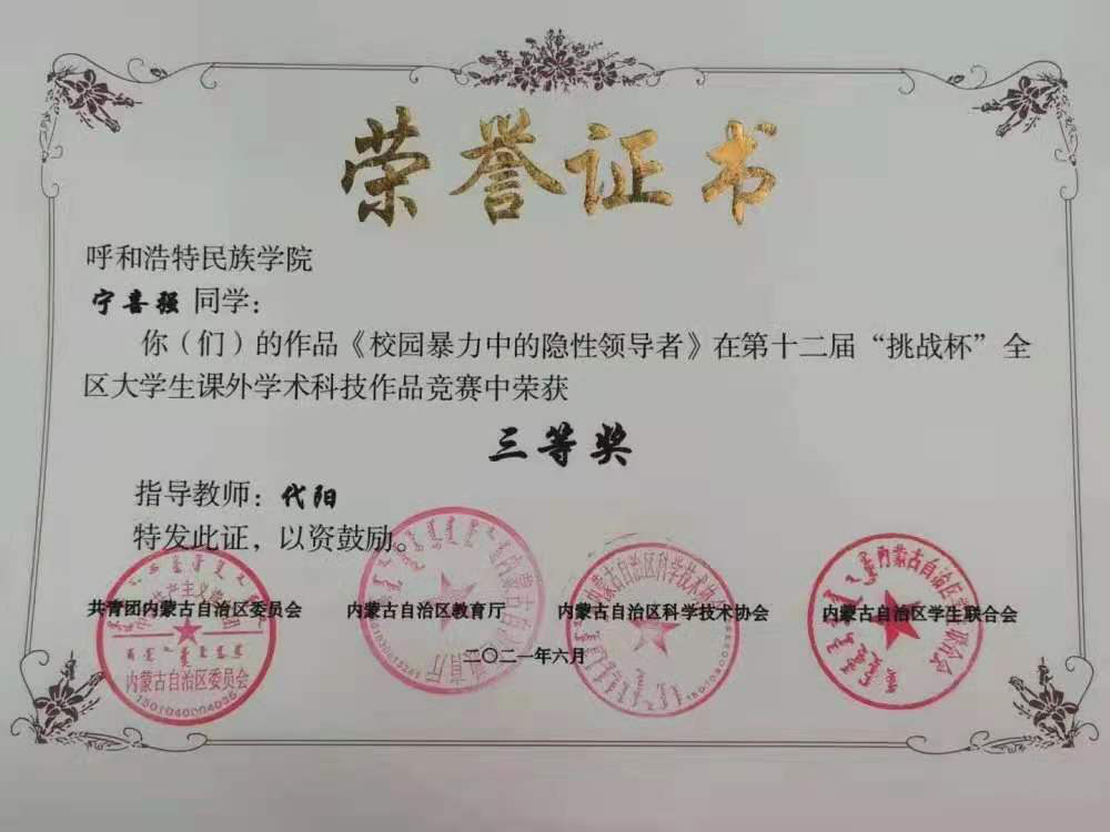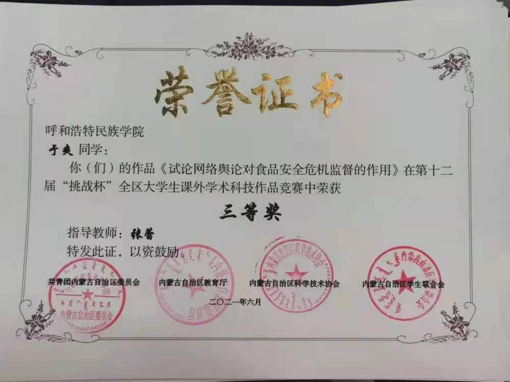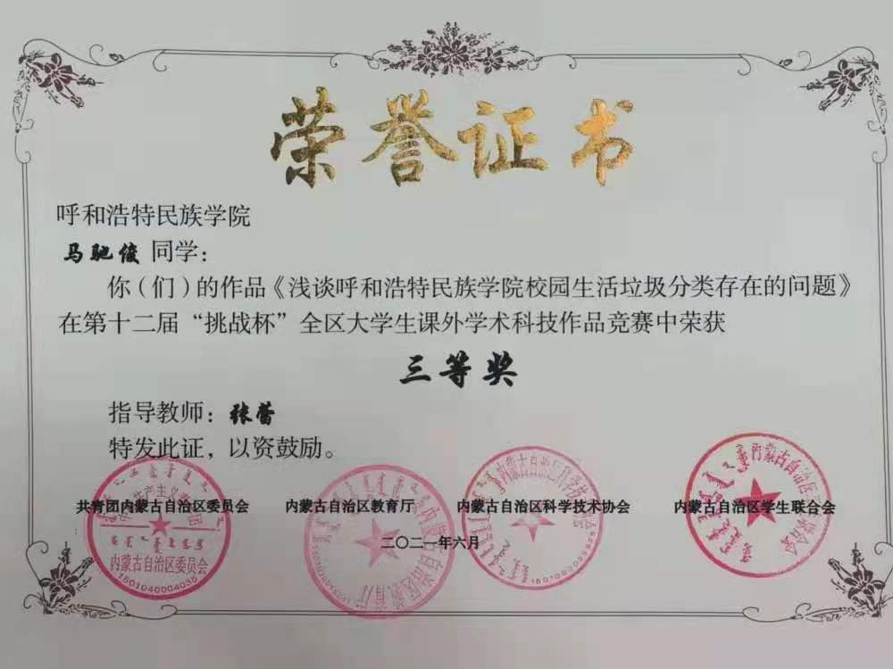 由共青团内蒙古自治区委员会、内蒙古自治区教育厅、内蒙古自治区科学技术协会和内蒙古自治区学生联合会主办的第十二届“挑战杯”全区大学生课外学术科技作品竞赛中我院学生喜获佳绩。学院教工党支部深入贯彻落实党史学习教育部署要求,党员教师亮出身份、履行职责,为学生们提供竞赛指导,筑梦成长。在张蕾老师和代阳老师的精心指导下,我院于爽同学的参赛论文《试论网络舆论对食品安全危机监督的作用》、马驰俊同学的参赛论文《浅谈best365官网中文版登录学生校园生活垃圾分类存在的问题》和宁喜强同学的参赛论文《校园暴力中的隐性领导者》在本次比赛中分别荣获“三等奖”。