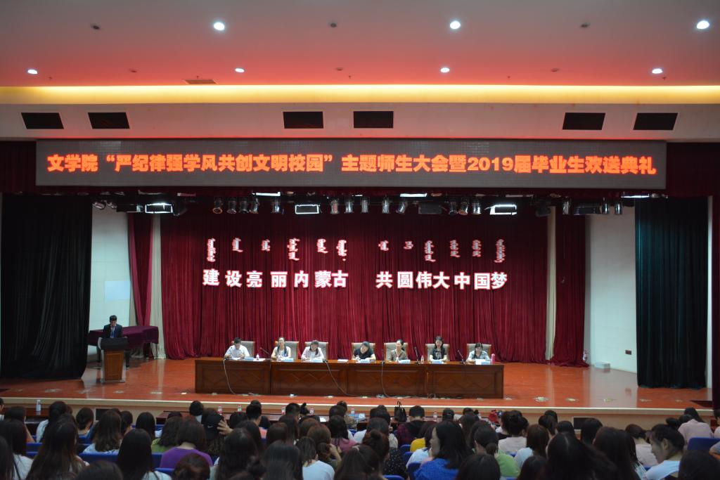 为狠抓学生纪律, 激发学生学习热情,欢送2019届毕业生,文学院于6月20日晚在图书馆二楼报告厅召开“严纪律、强学风、共创文明校园”主题师生大会暨2019届毕业生欢送典礼,文学院院长崔凤珍、党总支副书记包冬梅、副院长哈琴等近750名师生参加本次大会。