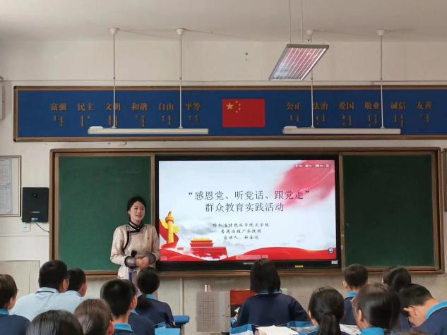 为将铸牢中华民族共同体意识内化于心,外化于行,勉励广大青少年坚定不移听党话、跟党走,4月12日上午文学院普通话推广实践团赴呼和浩特蒙古族学校开展“感党恩,听党话,跟党走”主题宣讲活动。