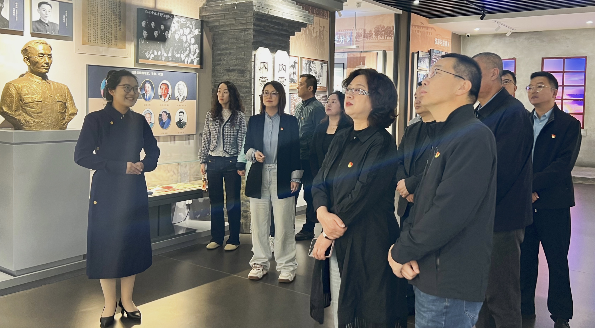 活动现场,专业讲解员为党员干部们生动讲解了各个展区的内容,通过丰富多样的展板和珍贵的历史图片,带领大家穿越时空,重温了新中国波澜壮阔的发展历程。参观过程中,党员干部们不仅聆听了讲解,还积极参与互动,深刻体会到铸牢中华民族共同体意识对于维护国家统一、促进民族团结的重要意义。此次活动不仅是文学院与中共内蒙古自治区委员会党校深化合作、携手并进、共谋发展的重要举措,更是双方致力于进一步强化支部共建机制、深化交流互鉴与协同合作的具体体现。