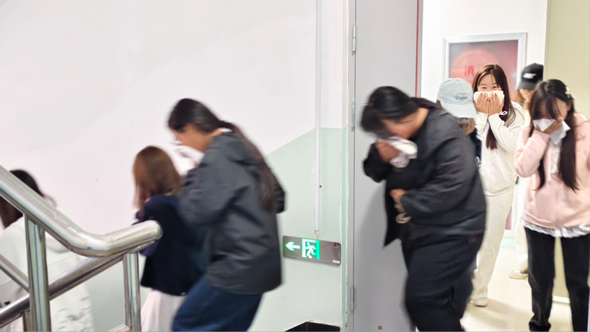 随着消防警报声响起,演练正式启动。同学们迅速进入应急状态,严格按照1号楼、2号楼预定疏散路线,用湿毛巾捂住口鼻,低姿弯腰快速有序撤离至户外空地。