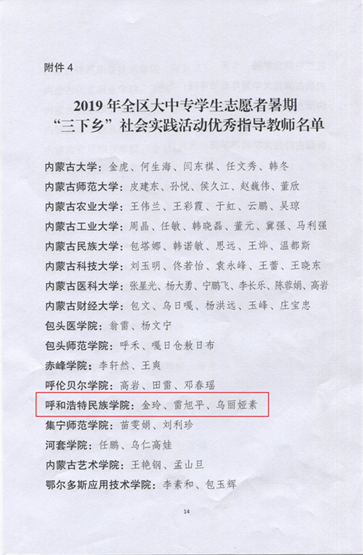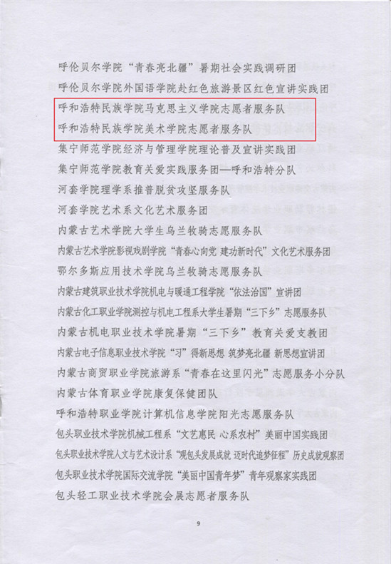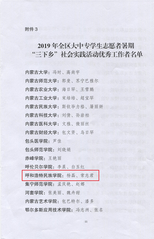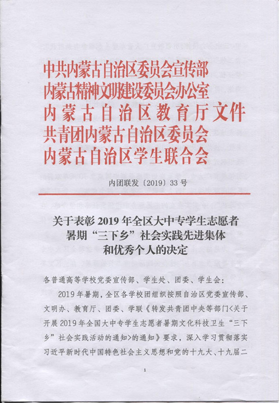 近日,中共内蒙古自治区委员会宣传部、自治区文明办、教育厅、团委、学联联合印发《关于表彰2019年全区大中专学生志愿者暑期“三下乡”社会实践先进集体和优秀个人的决定》(内团联发[2019]33号),表彰在2019年暑期“三下乡”社会实践活动中表现优秀、成绩突出的集体和个人。