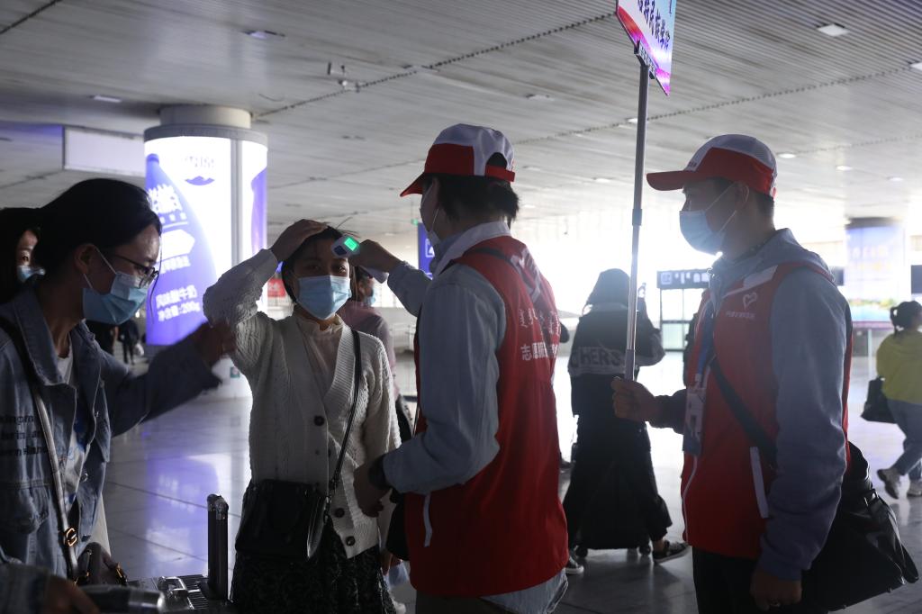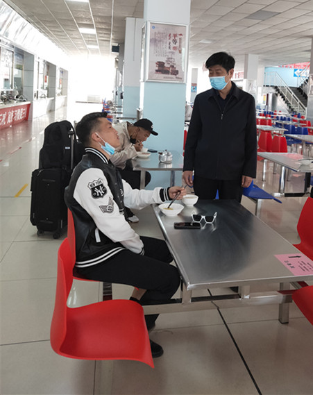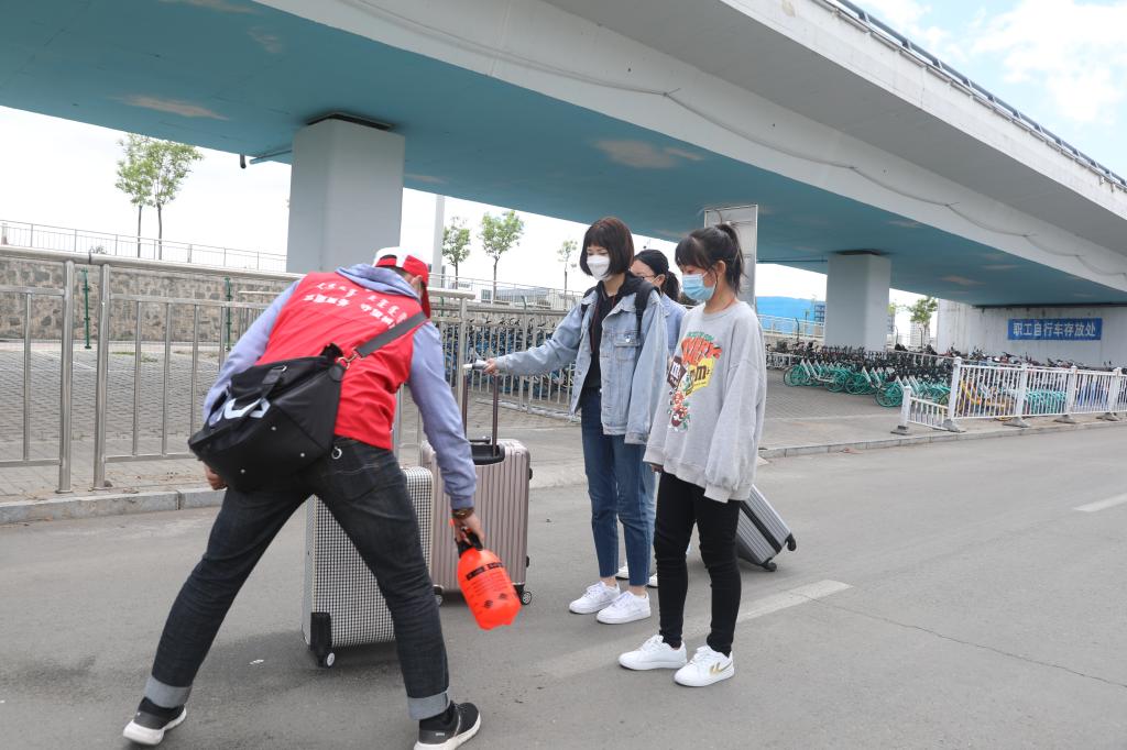 学校在呼和浩特市白塔机场和火车东站设置了接站点,12位老师全天接送每一位返校学生。老师接到学生后,组织学生经行李消杀,体温监测,足底消杀,按“Z”型间隔就座,乘校车返校。