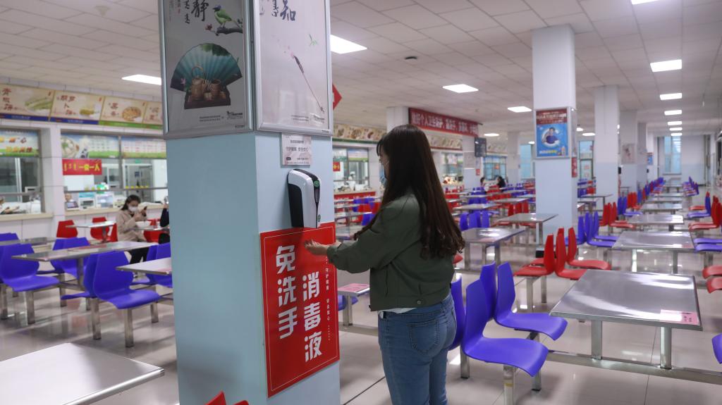 学生食堂全面开放,实施错时错峰就餐,学校在食堂为学生设置了洗手池及多处免洗手消毒液。学生间隔一米有序进入餐厅,一人一桌、同向就坐,餐后由指定出口离开。