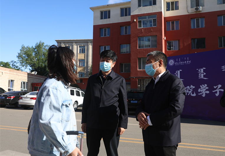 学校党委书记孙国权、校长格日乐图等校领导分别到报到处、学生寝室、食堂等地检查返校工作。