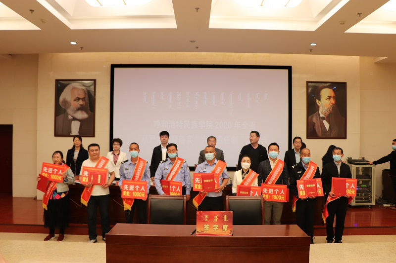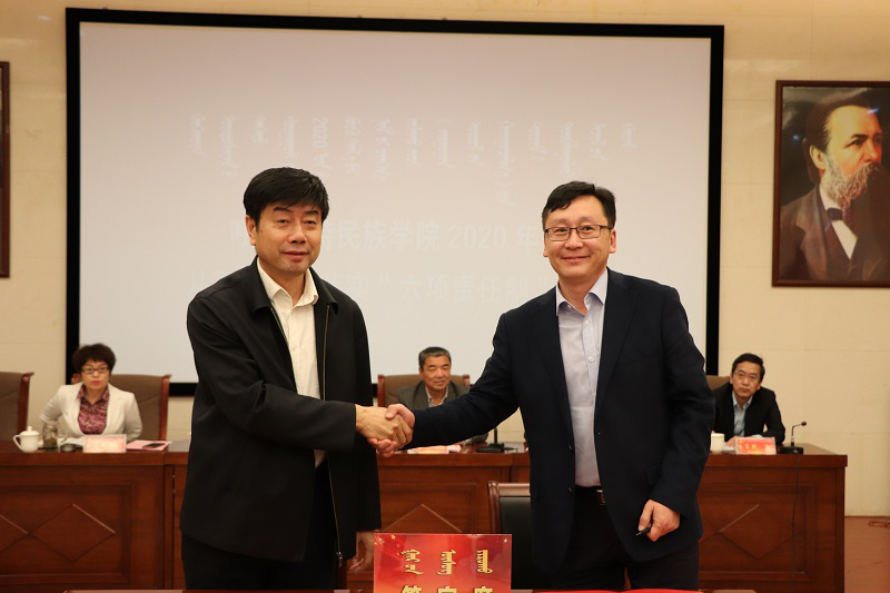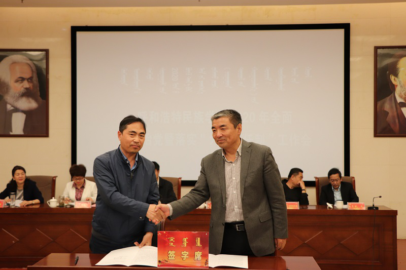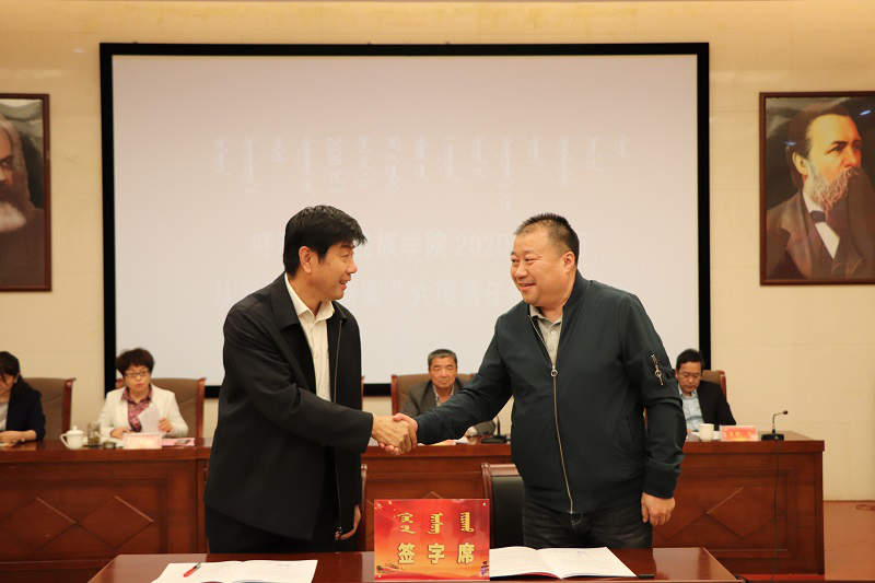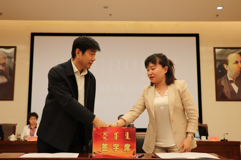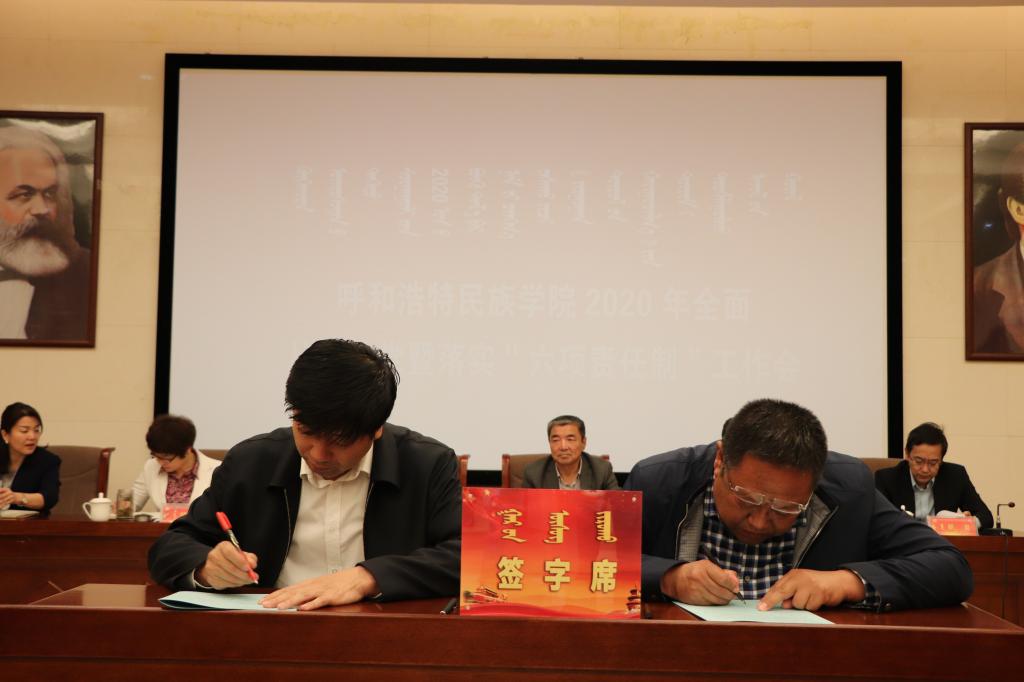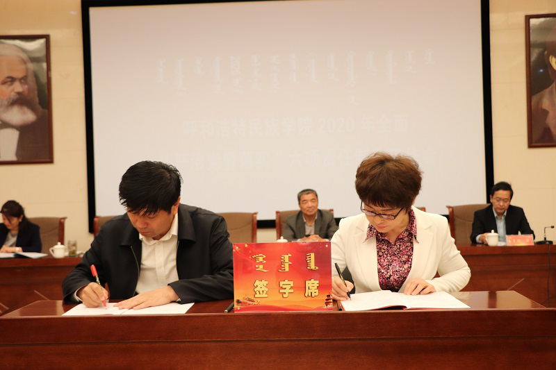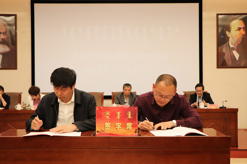 会上,孙国权书记代表学校党委与校领导班子签订“一岗双责”责任书,与各单位签订基层党建、党风廉政、意识形态、综合治理、保密工作、宗教工作责任书,格日乐图校长代表学校行政与各单位签订消防安全责任书。