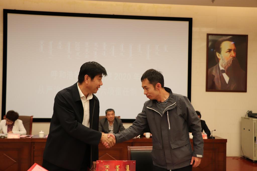 5月26日下午,学校在图书馆一楼报告厅召开2020年全面从严治党暨落实“六项责任制”工作会议。学校党政领导、党委委员、纪委委员、全校副处以上干部、各党总支纪检委员,党支部书记代表参加会议。会议由校党委副书记、校长格日乐图主持。