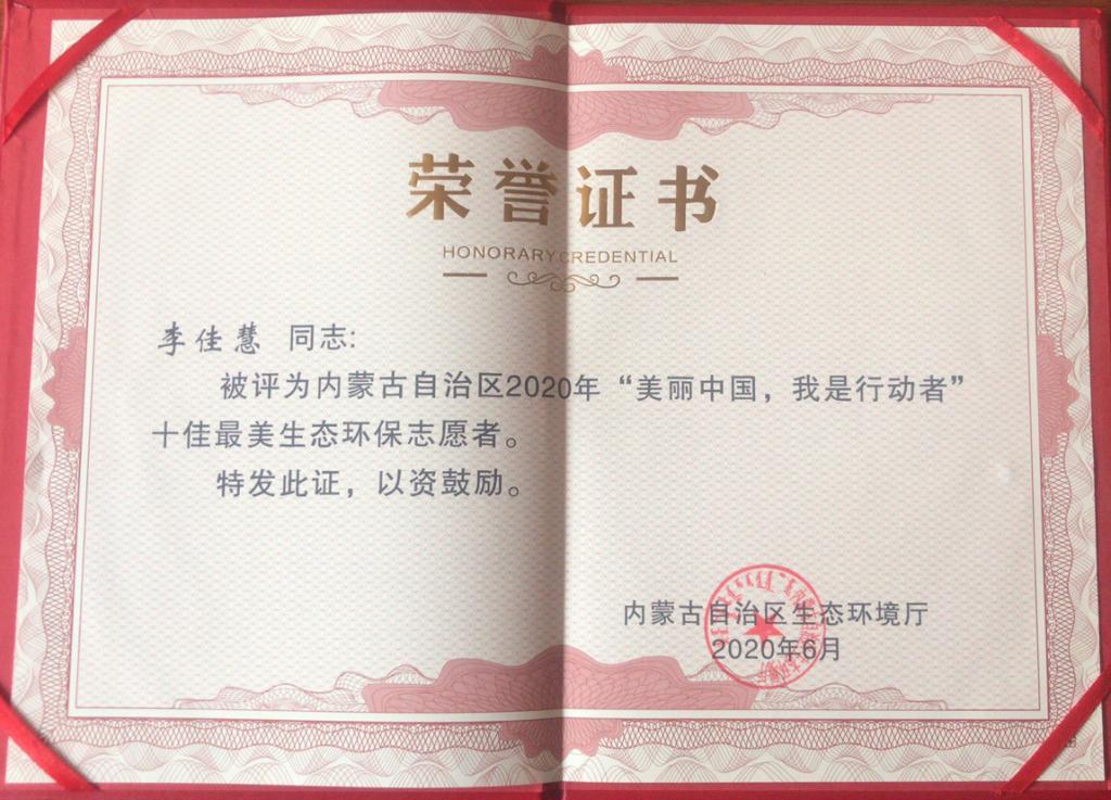 为深入宣传贯彻习近平总书记对内蒙古工作重要讲话精神,提高公众生态环保意识,凝聚加强生态环境保护全社会共识,内蒙古自治区生态环境厅与中国邮政集团公司内蒙古自治区分公司于6月5日联合举办2020年内蒙古自治区纪念六五环境日暨环邮战略合作签约仪式,表彰全区“十佳最美环保志愿者”,best365环境保护志愿者协会李佳慧同学荣获2020年“美丽中国,我是行动者”十佳最美生态环保志愿者荣誉称号。