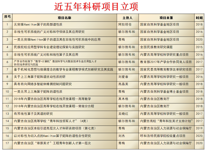 研精殚思,硕果累累。近五年,该专业团队成员先后获批国家自然科学基金项目3项、全国民族教育研究课题1项、教育部协同育人项目1项、自治区人才项目2项、自治区自然科学基金项目2项和其它省部级教学科研项目20多项;在《中国科学》《数学学报》《journal of mathematical analysis and applications》等国内外刊物上发表学术论文70多篇,其中SCI收录30多篇;出版教材和专著5部;邀请中国科学院张恭庆院士等国内外专家学者40余人次,组织参加各类教学科研会议50余人次,承办第八届非线性数学物理国际会议暨全国第十五届可积系统学术研讨会(2019年)等会议。2019年,数学学科获批为国家民委重点学科。