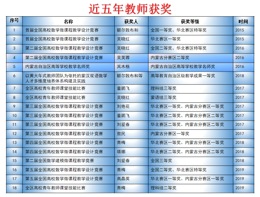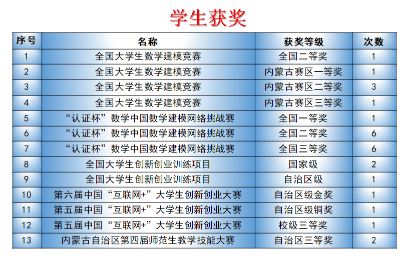 天道酬勤,一树百获。近几年,该专业师生先后获得全国高校数学微课程教学设计竞赛全国一、二等奖;全国大学生数学建模竞赛二等奖等50多项省部级各类奖项;现有自治区高等学校在线开放课程2门(2018年)和精品在线开放课程(金课)1门(2021年);建设自治区高等学校实验教学示范中心(2017年)1个和教育部民族教育发展中心重点研究基地(2015年)1个,挂靠学校成立内蒙古高等教育学会数学教育分会(2016年);先后20多名学生考取太原理工大学、陕西师范大学、内蒙古大学等高校硕士研究生,其中3人分别直推为武汉科技大学和内蒙古大学的博士研究生。特别是,2018年实现学校高等教育自治区级教学成果一等奖零的突破。