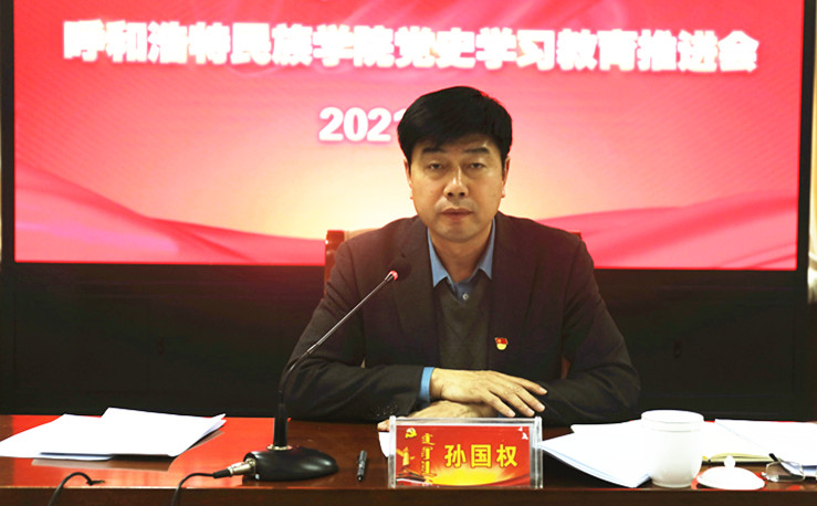 学校党委书记、党史学习教育领导小组组长孙国权作讲话。他在讲话中强调:一是要深化思想认识,进一步提高政治领悟力,深刻认识党史学习教育总体要求。要在“为什么学”上深化认识。学党史要在思想上政治上受教育,真正从党的非凡历程中感悟思想伟力,汲取智慧和力量。要在“明什么理”上深化认识。明理受教育就是要深刻领悟中国共产党为什么能、马克思主义为什么行、中国特色社会主义为什么好等道理,弄清楚其中的历史逻辑、理论逻辑、实践逻辑。要在“如何明理”上深化认识。学党史就要老老实实地学、认认真真地学,从中真正感悟马克思主义的真理力量和实践力量,增强用党的创新理论武装头脑的政治自觉、思想自觉、行动自觉。二是要明确形势任务,进一步提高政治判断力,准确把握党史学习教育重点工作。要充分认清党史学习教育的形势要求,深入学习领会和贯彻落实对习近平总书记的重要要求和中央、自治区党委的相关部署安排,切实把打牢学习基础、抓牢关键少数、扎实开展“为师生办实事”实践活动、组织好群众性主题宣传教育活动等重点工作抓紧抓实抓好。三是要强化责任担当,进一步提高政治执行力,确保党史学习教育工作任务落到实处。党委、各党总支、党支部三级党组织都要切实落实主体责任,在落细做实上下功夫见成效。领导小组办公室要切实发挥好牵头抓总、协调各方的作用,贯通上传下达渠道,抓实抓细方案落实,精准指导各党总支、党支部开展好每个环节、每个阶段的学习教育。各督导组要在指导和督导上狠下功夫,要严格执行“三督三看一指导”的要求,坚持严的标准,落实严的要求,全覆盖督促指导、全过程严格把关。全体师生要严守党史学习教育各项纪律。