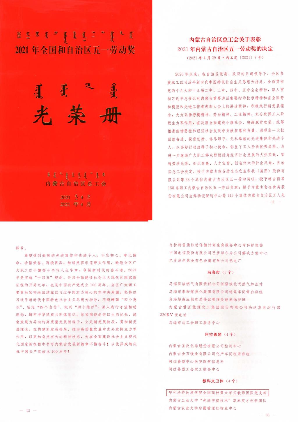 近日,内蒙古自治区总工会评选表彰了一批为全区发展做出积极贡献的劳动者、劳动集体,并授予五一劳动奖状、奖章和工人先锋号、五一巾帼标兵岗、五一巾帼标兵。best365数学与大数据学院黄大年式教师团队党支部荣获内蒙古自治区工人先锋号;医务室荣获内蒙古自治区“五一巾帼标兵岗”荣誉称号。