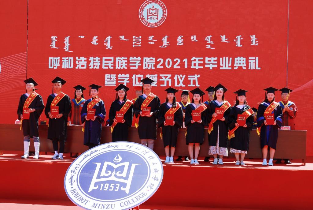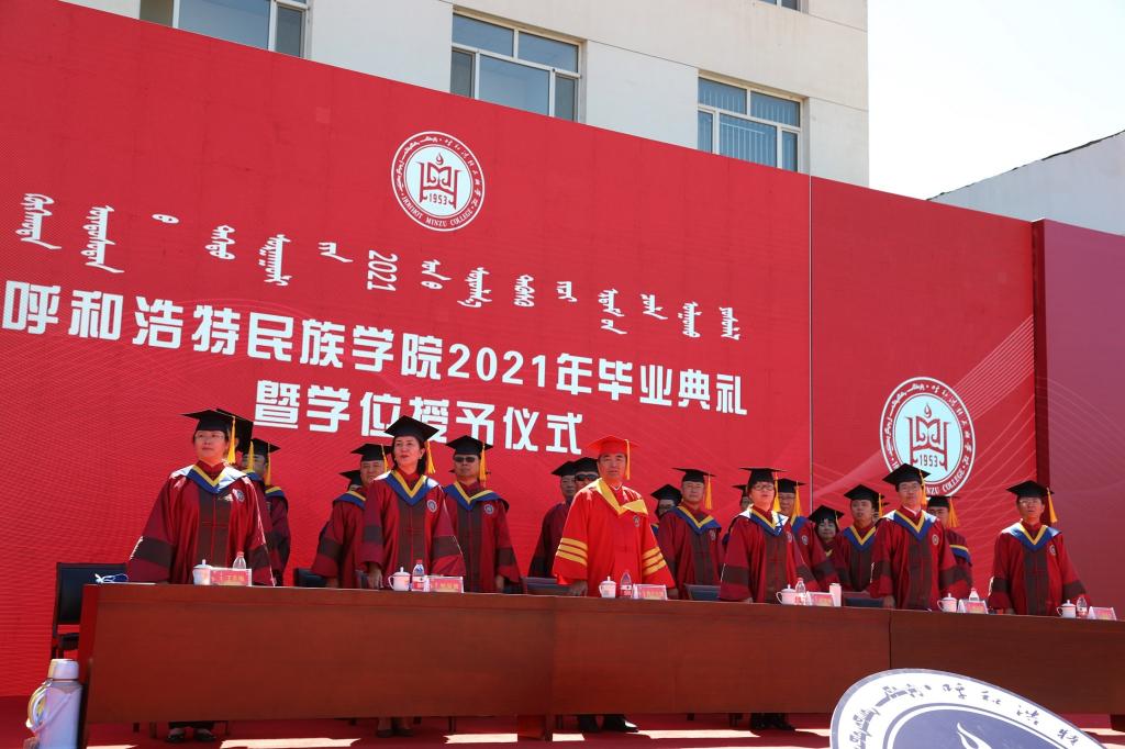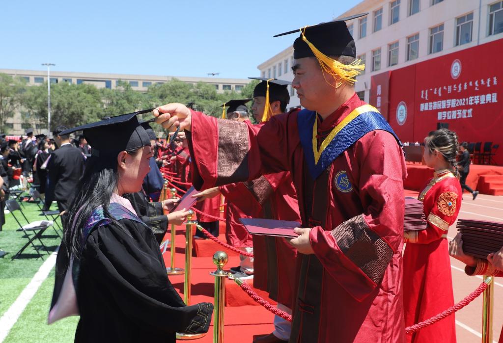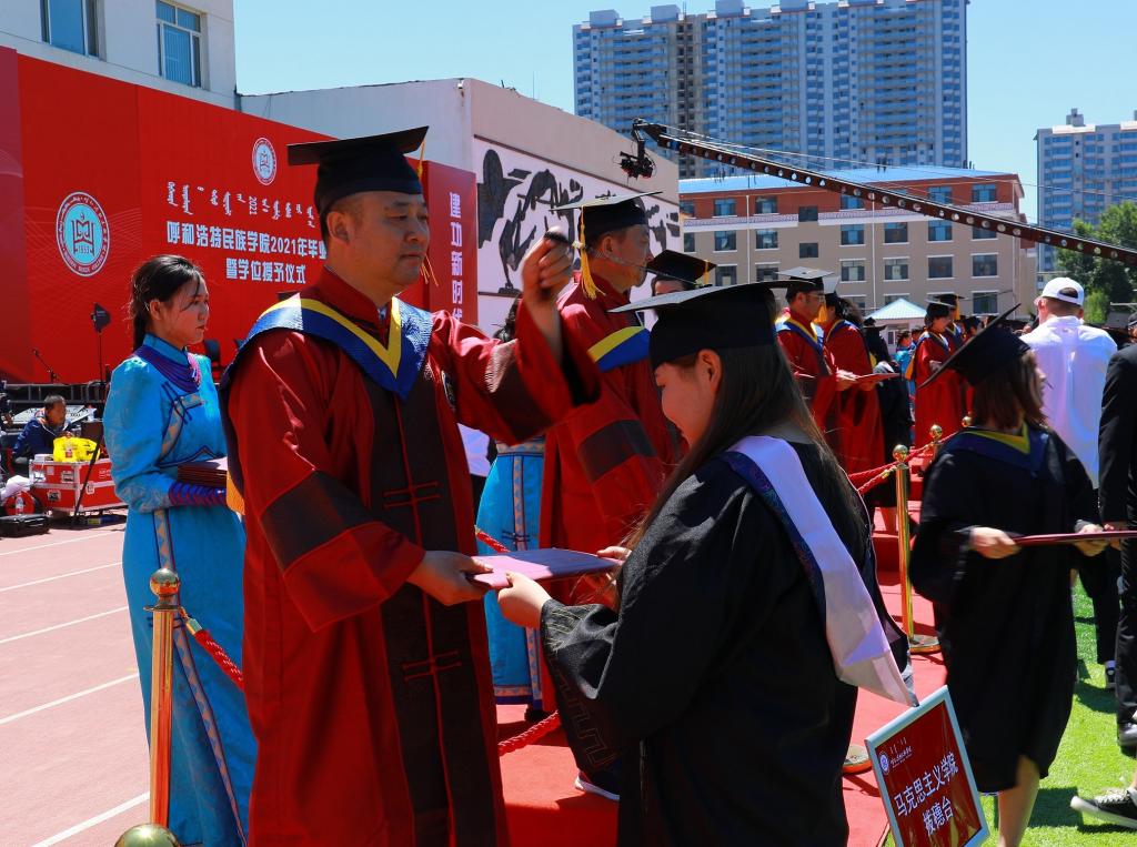毕业典礼上,教务处副处长哈斯额尔德尼宣读了学校本专科生毕业及学士学位授予情况。韩伟新副校长宣读了《关于表彰2021届优秀毕业生的决定》。校领导为优秀毕业生颁奖。
