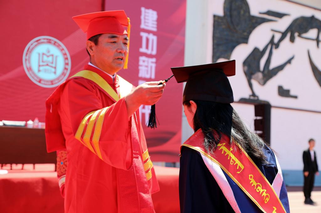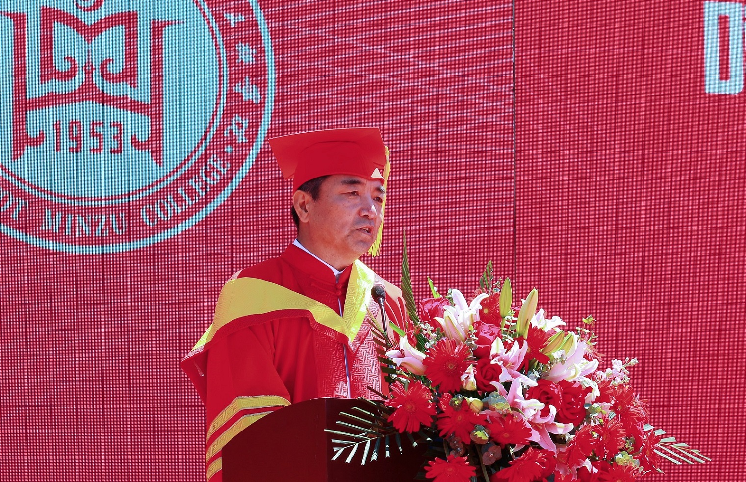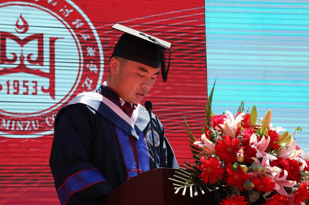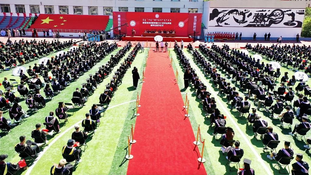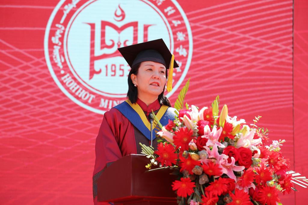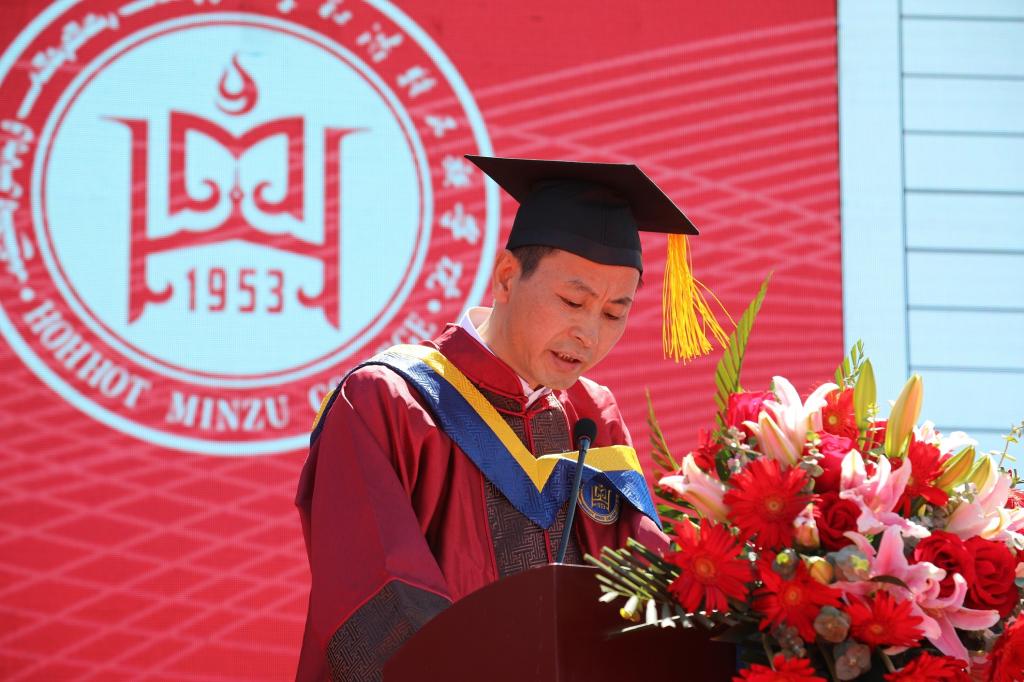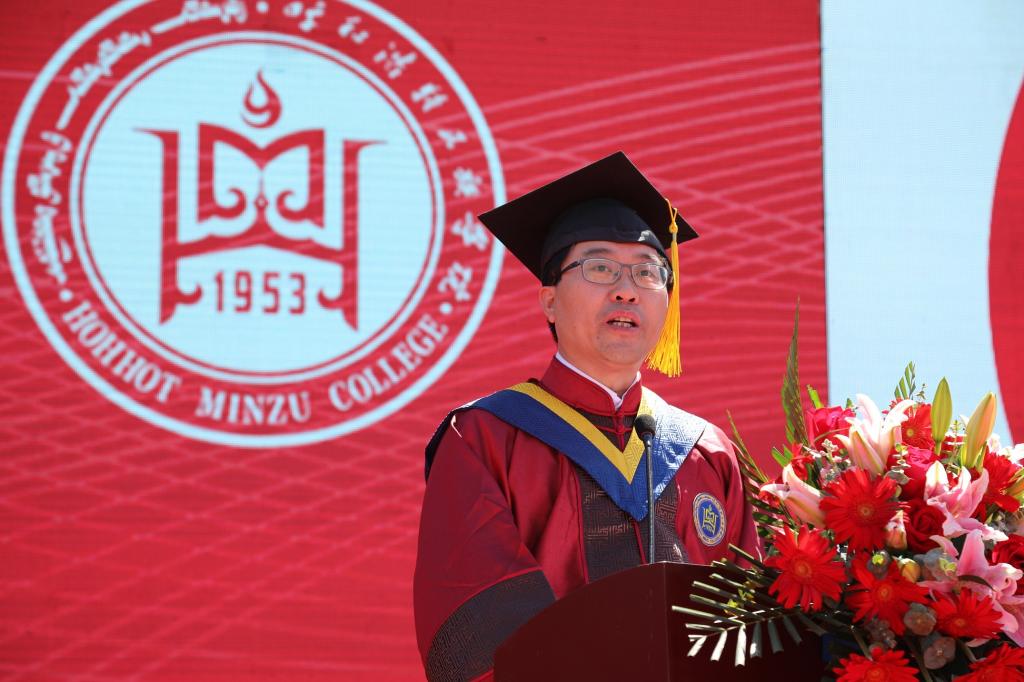 党委副书记、校长、校学位评定委员会主任格日乐图致辞。他代表全体师生员工向圆满完成学业的各位同学表示热烈的祝贺,向悉心指导的老师们,辛勤劳动的教职员工和望子成龙的家长们表示崇高的敬意和衷心的感谢。他简要回顾了2021届毕业生在校期间取得的成绩,师生共同推动学校高质量发展的成果。格日乐图校长给予毕业生五点嘱托,一要坚定信念,不忘初心,逐梦前行;二要心怀家国,敢于担当,将“小我”融入“大我”,成就“民院人”的社会美誉;三要不负韶华,砥砺奋斗。在奋勇搏击中放飞青春梦想,在砥砺前行中激扬青春力量;四要脚踏实地,勇毅笃行。勤而有恒,事无不成;五要心存善良,学会感恩。感恩学校的栽培、恩师的教诲、父母的养育、同窗的陪伴,感恩伟大的祖国,感恩伟大的党。讲话最后,格日乐图校长祝愿所有毕业生,都能够坚定信念、胸怀祖国、脚踏实地、担当作为,勇立新时代潮头,开启人生新篇章!