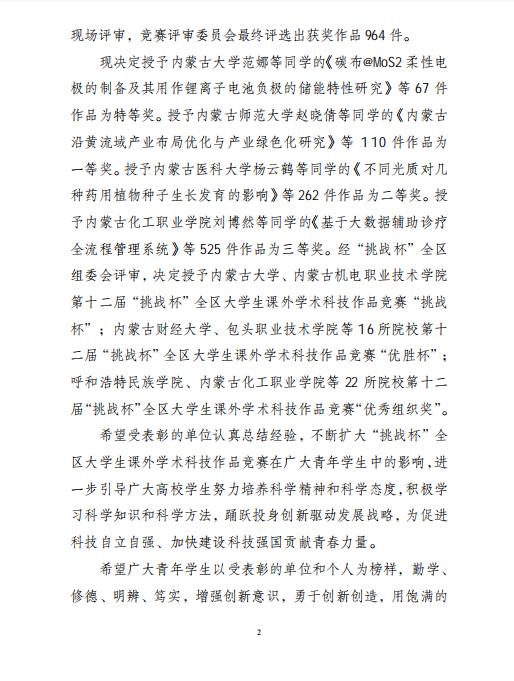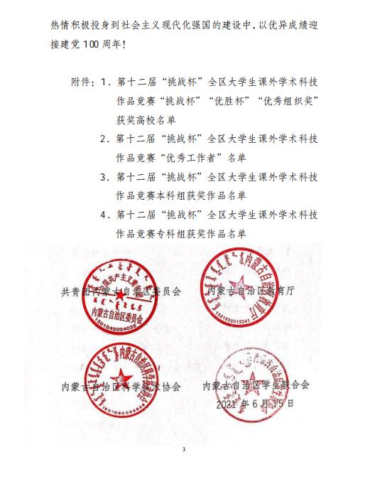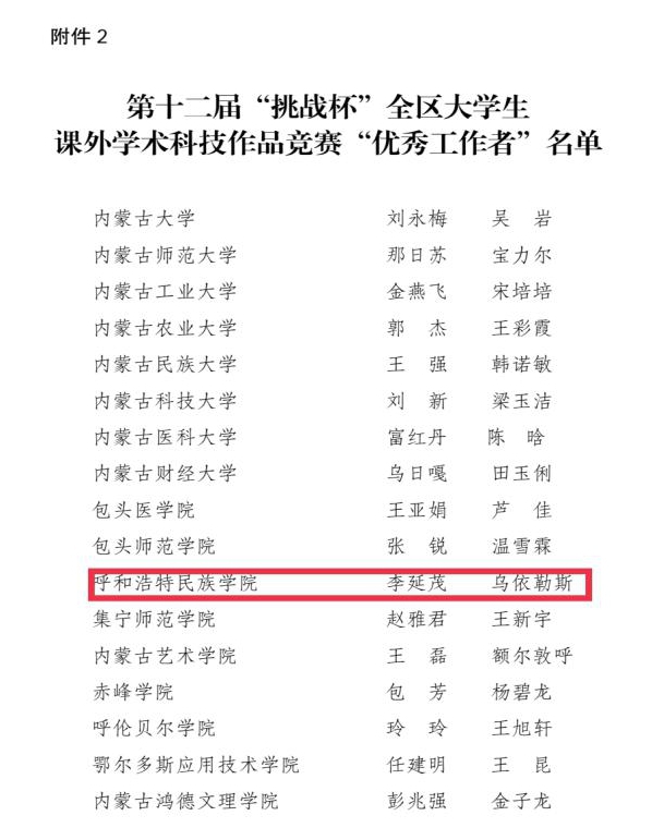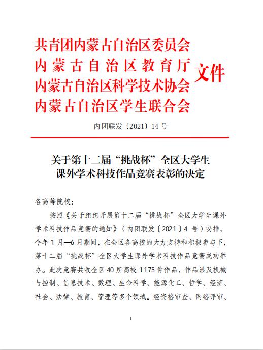 近日,共青团内蒙古自治区委员会、内蒙古自治区教育厅、内蒙古自治区科学技术协会和内蒙古自治区学生联合会发布《关于第十二届“挑战杯”全区大学生课外学术科技作品竞赛表彰的决定》。best365在本次竞赛中荣获“优秀组织奖”,李延茂、乌依勒斯被评为“优秀工作者”,参赛学生作品荣获多个奖项。