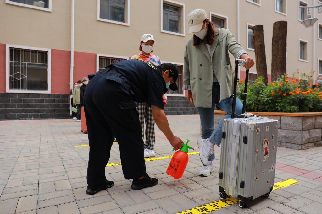 学生间隔一米,经行李消杀、足底消杀、手部消杀、登记及测量体温合格后,方可进入宿舍。