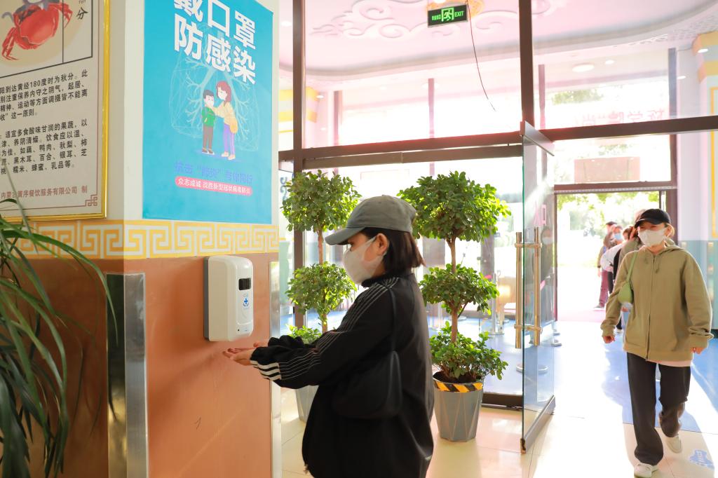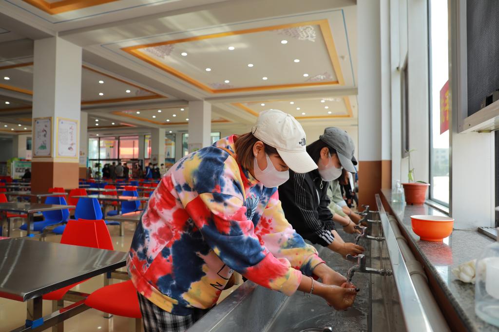 学生间隔一米,经测温通道、手部消杀,依次排队进入食堂。进入食堂后,需间隔一米,排队打饭,错位就坐用餐。