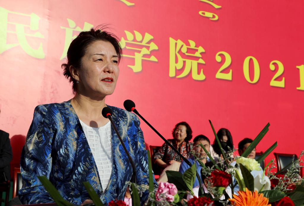 随后,胡春梅副书记宣读了《关于表彰2021级新生军训工作先进集体和个人的决定》,大会对会操、内务、板报、拔河、歌咏、军事训练先进集体和优秀教官、先进个人、优秀学生干部、优秀标兵进行了表彰。音乐学院沈冬怡同学代表2021级全体同学向学校汇报发言,她分享了军训感受并表态在今后的学习和生活上要发扬坚韧不拔、百折不挠的精神,不断提高自我综合素质,做一个积极向上、身心健康的新时代大学生;体育学院布音图同学代表教官和老生发言,他希望学弟、学妹们,要珍惜大学时光,做一些能够让自己充实的事情,不断提升自身修养,同时也要自信、自立、自强,用自信撑起一方天空,用自立经“赢”大学,在大学生活中绽放青春,扬帆起航。