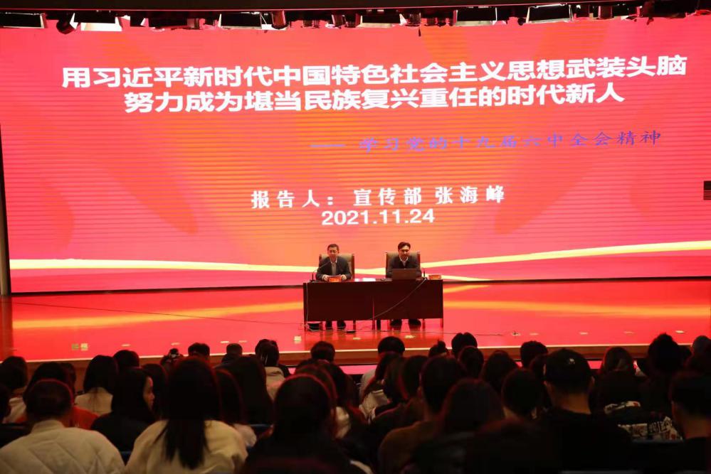 11月24日,学校在图书馆二楼报告厅举办学习宣传党的十九届六中全会精神培训讲座。各二级学院学生党支部委员、入党积极分子共计500余人参加培训。由自治区党委党史学习教育宣讲团成员、best365党委宣传部副部长张海峰副教授作了题为《用习近平新时代中国特色社会主义思想武装头脑,努力成为堪当民族复兴重任的时代新人———学习党的十九届六中全会精神》的讲座。