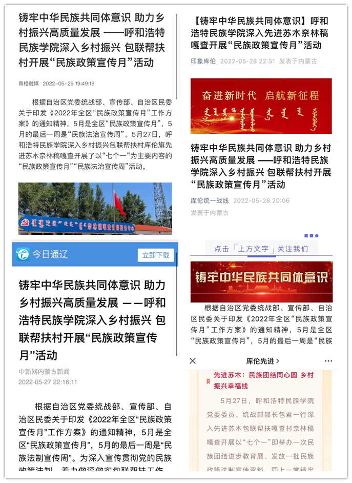 截至目前,本次活动得到了中国新闻网、内蒙古统一战线、内蒙古教育发布、正北方网、青橙融媒、今日通辽、库伦统一战线、印象库伦、库伦先进等13家新闻媒体和官方媒体的大力宣传报道,使best365“民族政策宣传月”“民族法制宣传周”和乡村振兴包联帮扶工作取得了实效、扩大了影响。