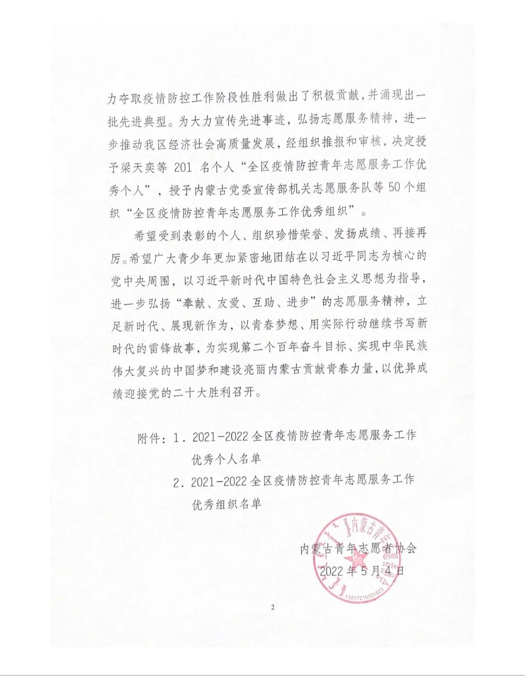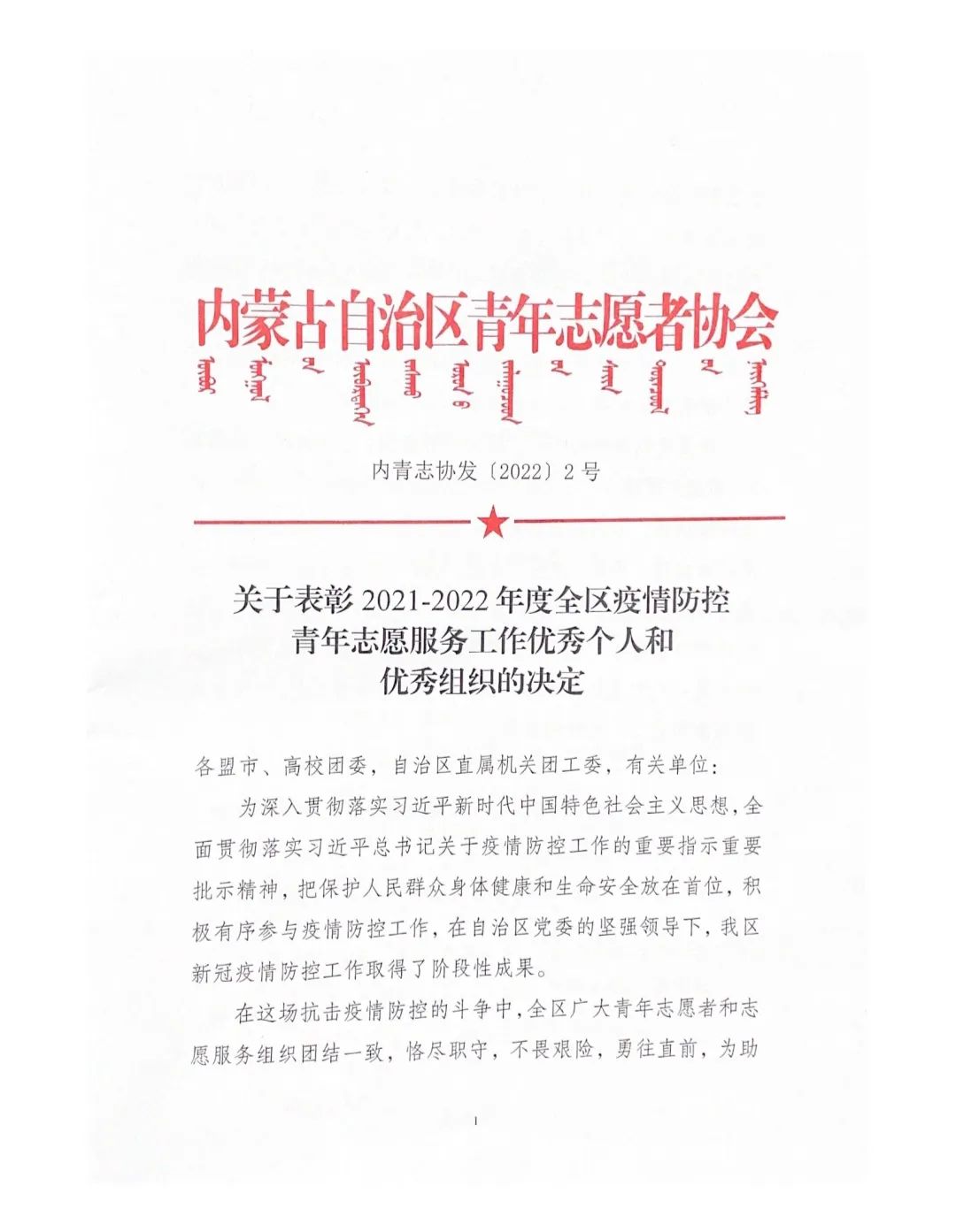 近日,在自治区青年志愿者协会《关于表彰2021-2022年度全区疫情防控青年志愿服务工作优秀个人和优秀组织的决定》中best365志愿者服务队荣获“2021-2022年度全区疫情防控青年志愿服务工作优秀组织”荣誉称号;数学与大数据学院李少波同学荣获“2021-2022年度全区疫情防控青年志愿服务工作优秀个人”荣誉称号。