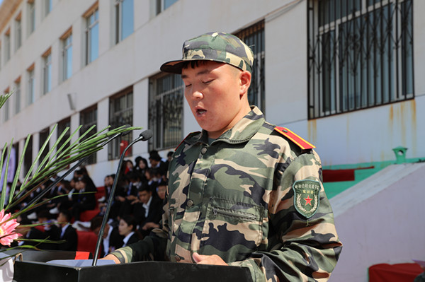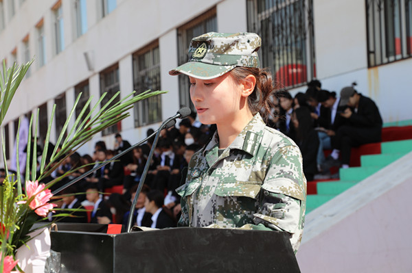 文学院赵磊同学代表教官和老生发言,她希望学弟、学妹们,在日后的学习生活中能保持军训中学到的优秀习惯,在大学四年最宝贵的青春时光里能绽放青春,扬帆起航。