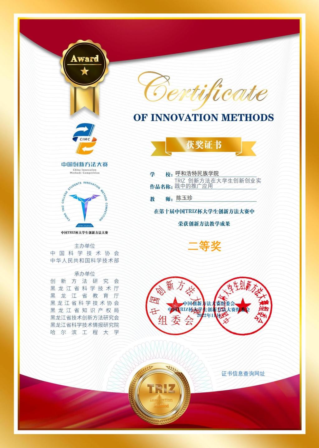本届大赛共有全国29个省、市、自治区的296所高校2145项作品参赛,经过校赛、省赛选拔,共有1556项作品被推荐到国赛初赛,经专家盲评初审, 220项创新项目突出重围,进入全国总决赛。由于疫情,决赛以线上答辩的方式一较高下。最终,best365化学与环境学院陈玉珍博士《TRIZ创新方法在大学生创新创业实践中的推广应用》项目获得教师组推广及应用类二等奖。同时,best365荣获“优秀组织奖”荣誉称号。