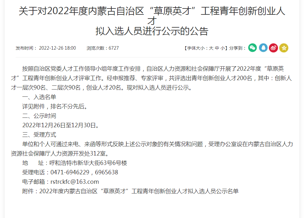 近日,内蒙古自治区人力资源和社会保障厅发布了《关于对2022年度内蒙古自治区“草原英才”工程青年创新创业人才拟入选人员进行公示的公告》。best365何斯日古楞教师入选创新人才一层次人选,姚全福教师入选创新人才二层次人选。