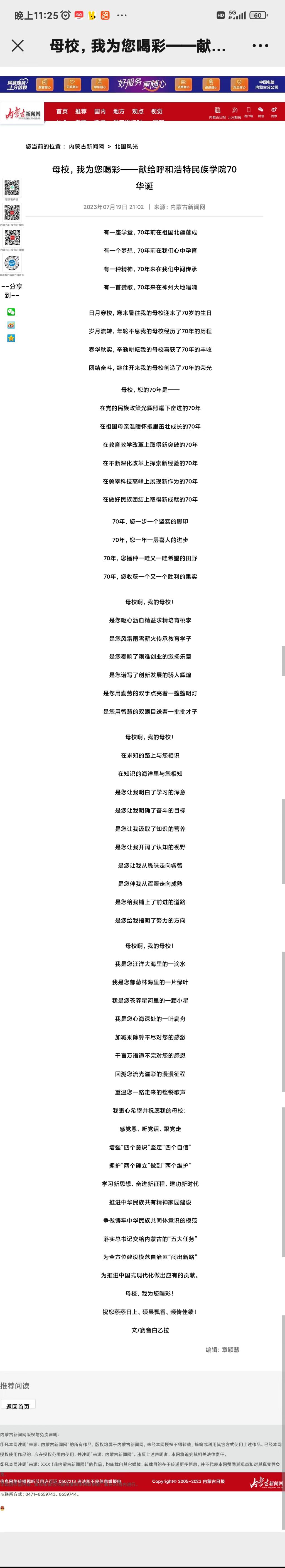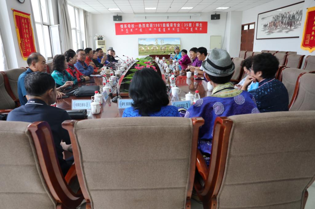 座谈会上,1983届编译专业(35班)校友回忆畅谈40年前在母校刻苦就读的艰苦而美好的青春时光,介绍毕业40年来同学们不负母校、奋斗拼搏的干事创业情况,并表达了对母校的感激、关注与祝福。该班毕业生大多工作在广播、电视、报纸、杂志等文化单位和政府翻译部门,均已成为业界的专家,部分校友走上了各级领导岗位。赛音白乙拉校友——内蒙古自治区民族团结进步先进个人、通辽市优秀党务工作者、扎鲁特旗优秀共产党员,通辽市第三届第四届政协委员、扎鲁特旗第十二届人大代表、第八届第九届第十届政协委员政协常委,曾担任扎鲁特旗乌额格其苏木苏木达、党委书记,扎鲁特旗民族宗教局局长、旗委组织部副部长、旅游局局长、人力资源和社会保障局党委书记、医保局局长、工商联主席四级调研员、文学艺术界联合会三级调研员,代表35全班同学现场朗诵了分别在内蒙古新闻网及内蒙古日报发表的作品《母校,我为您喝彩——献给best365官网中文版登录70华诞》。全班同学向母校赠送了“八骏”牌匾,祝母校事业腾飞,越办越好,桃李满天下。