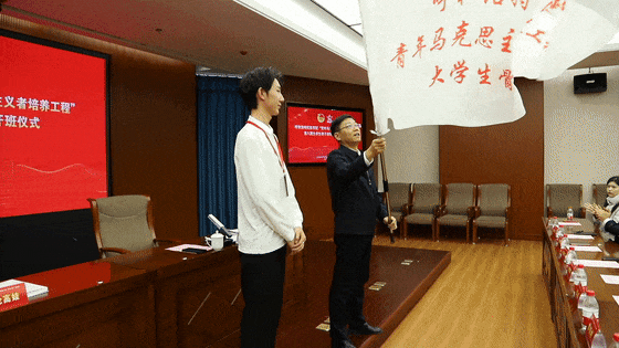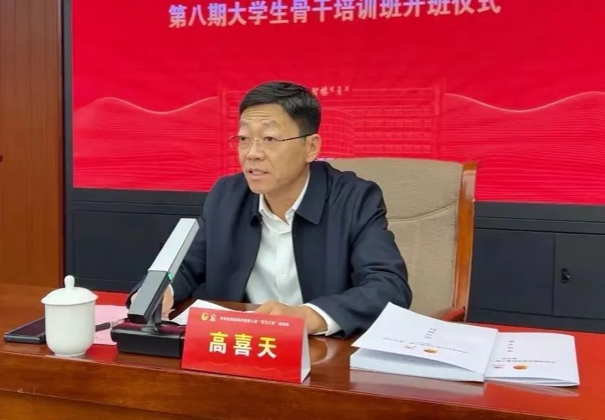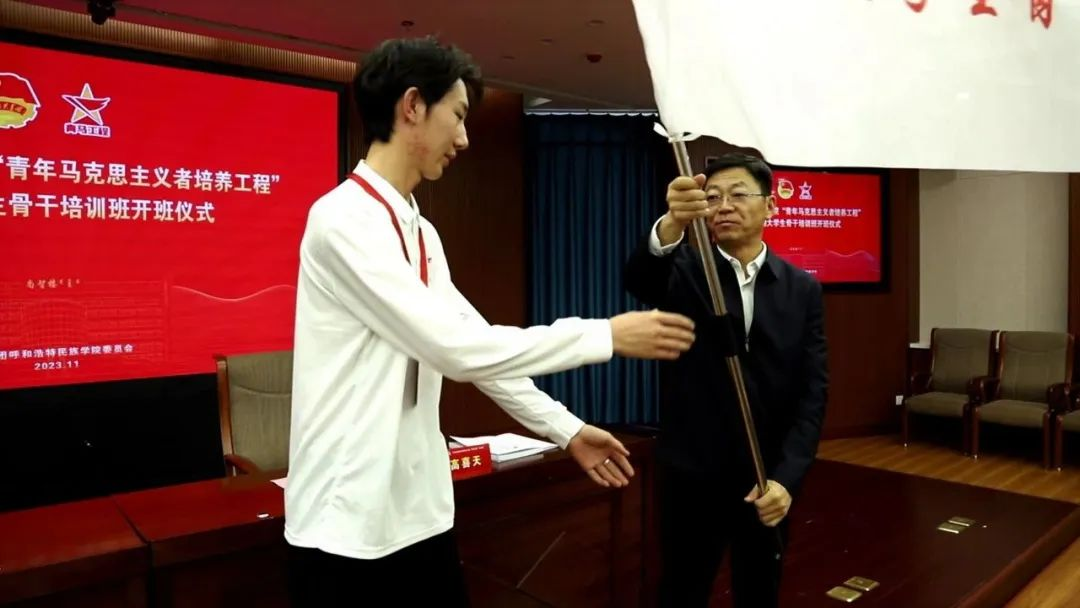 高喜天作动员讲话时对学员提出了三点希望:一是广大团员青年要坚定理想信念,加强理论自觉和行动自觉,坚持不懈用马克思主义最新成果习近平新时代中国特色社会主义思想武装头脑、指导实践。二是广大团员青年要刻苦学习,聚焦使命担当,在学习中要勤于思考,努力创新,以理论促实践,以实践深化对理论的认识。三是广大团员青年要甘于奉献社会,思想上志存高远,学习上勇攀高峰,牢固树立中华民族共同体意识,自觉树立马克思主义国家观、民族观、历史观、文化观,自觉维护民族团结光荣传统。最后,他叮嘱各位学员要珍惜宝贵的学习机会,牢记习近平总书记对广大青年的谆谆教诲,在实践中锤炼自己的意志品质,提高自己的能力和水平,为推动学校高质量发展奉献青春力量。随后,高喜天为本期青马班授旗。