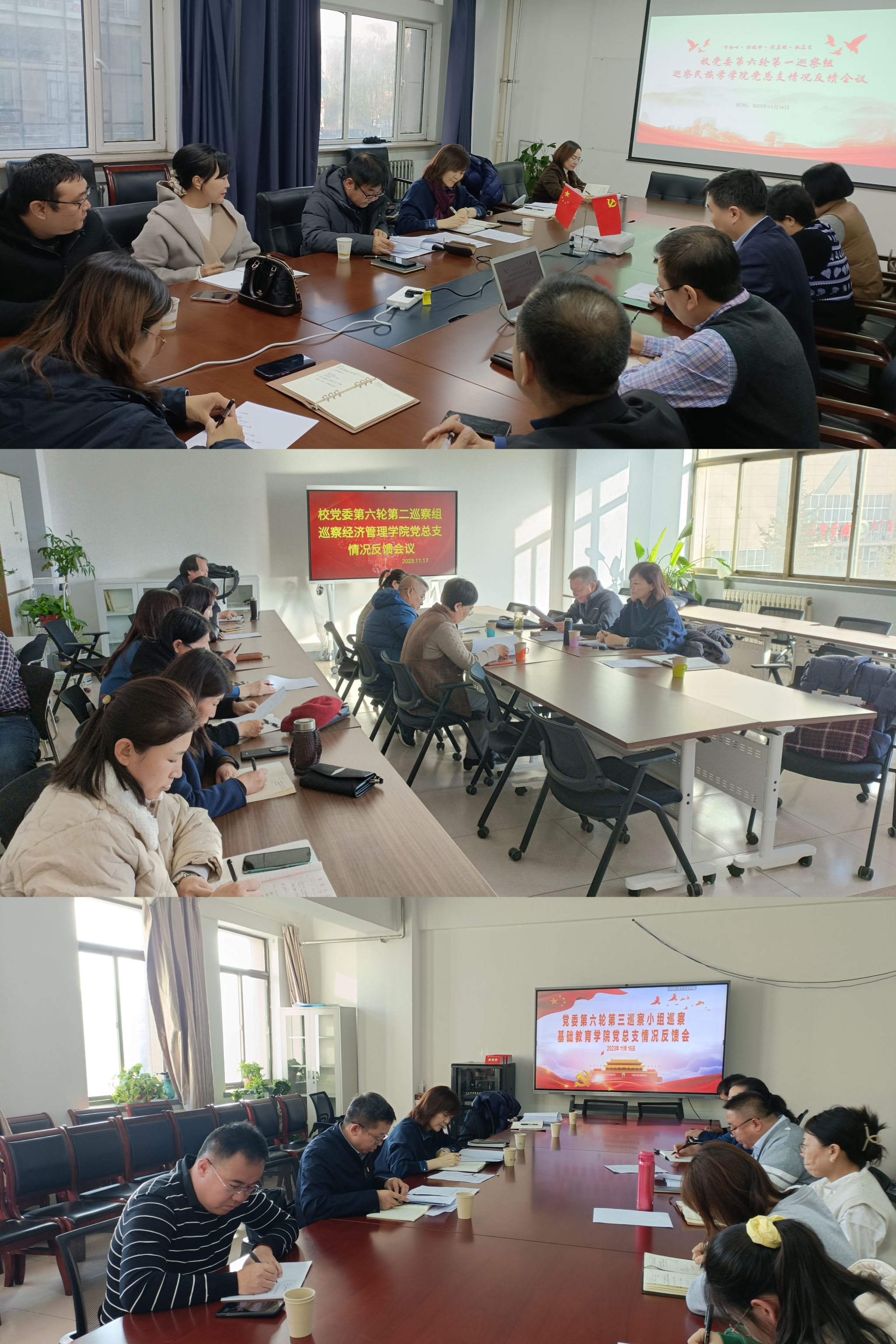 随后,校党委第六轮巡察三个小组分别赴民族学学院、经济管理学院和基础教育学院召开第六轮巡察意见反馈会议,传达巡察工作领导小组会议精神和集中反馈会议上王冬梅书记的讲话精神,并反馈本次巡察情况。会上,三个被巡察单位的主要负责同志做表态发言。
