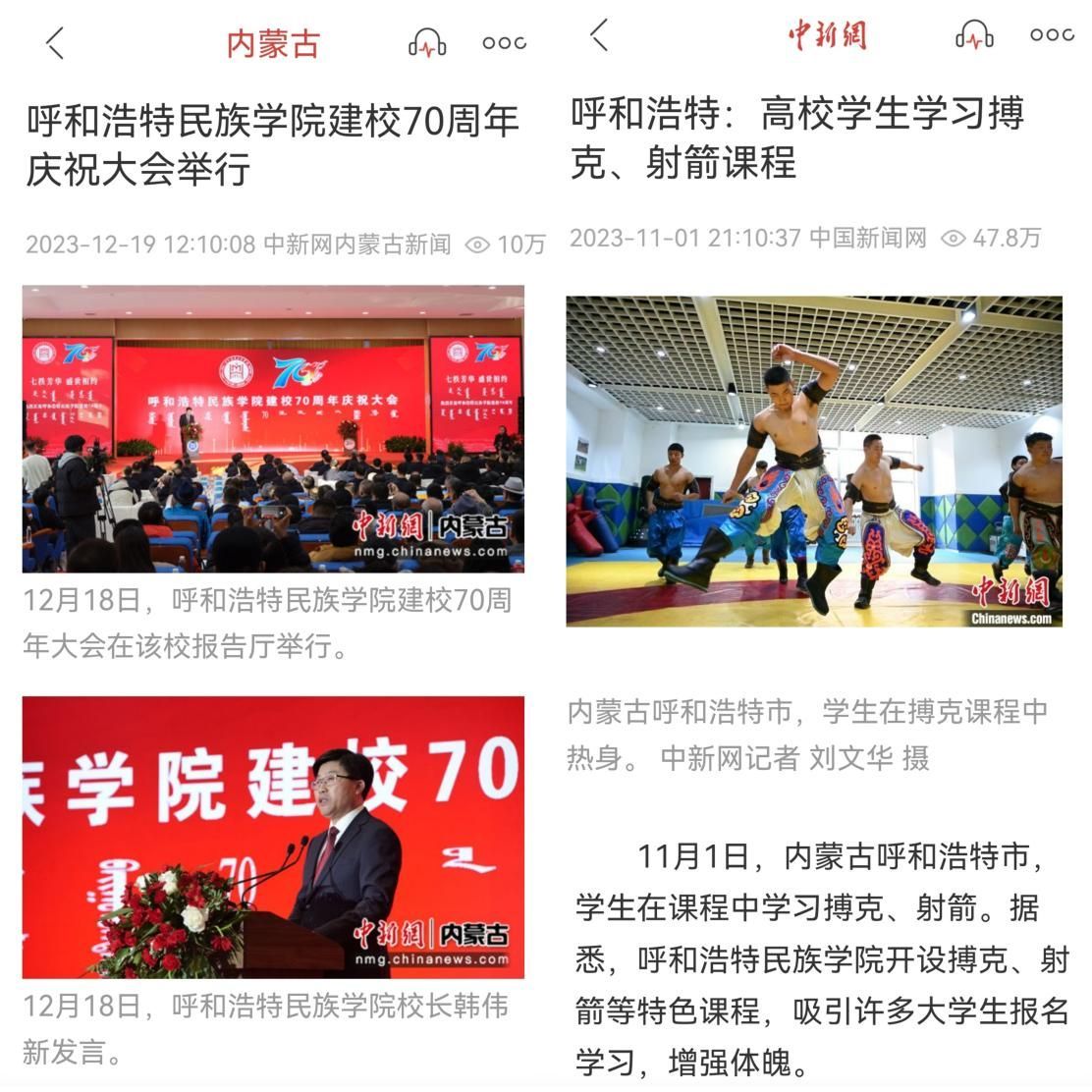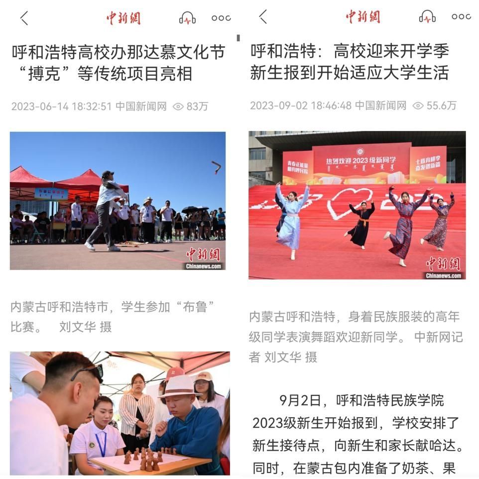 best3652023年度在中国新闻网发布的题为《呼和浩特高校办那达慕文化节“搏克”等传统项目亮相》新闻单条点击量为83万,题为《呼和浩特:高校迎来开学季 新生报到开始适应大学生活》新闻单条点击量为55.6万,题为《呼和浩特:高校学生学习搏克、射箭课程》新闻单条点击量为47.8万,题为《best365官网中文版登录建校70周年庆祝大会举行》新闻单条点击量为10万。