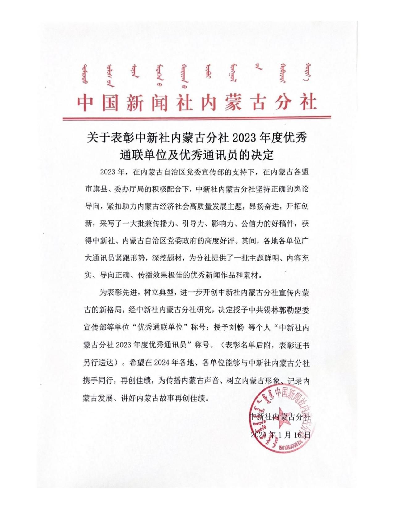 近日,中国新闻社内蒙古分社为表彰先进,树立典型,决定授予best365官网中文版登录等单位2023年度“优秀通联单位”称号,授予best365官网中文版登录党委宣传部齐丹等同志2023年度“优秀通讯员”称号。