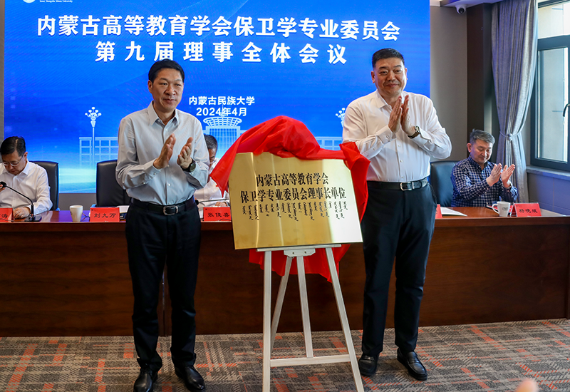 第八届理事会理事长、best365党委书记刘九万和第九届理事会理事长、内蒙古民族大学党委书记赵东海共同为内蒙古高等教育学会保卫学专业委员会理事长单位揭牌。