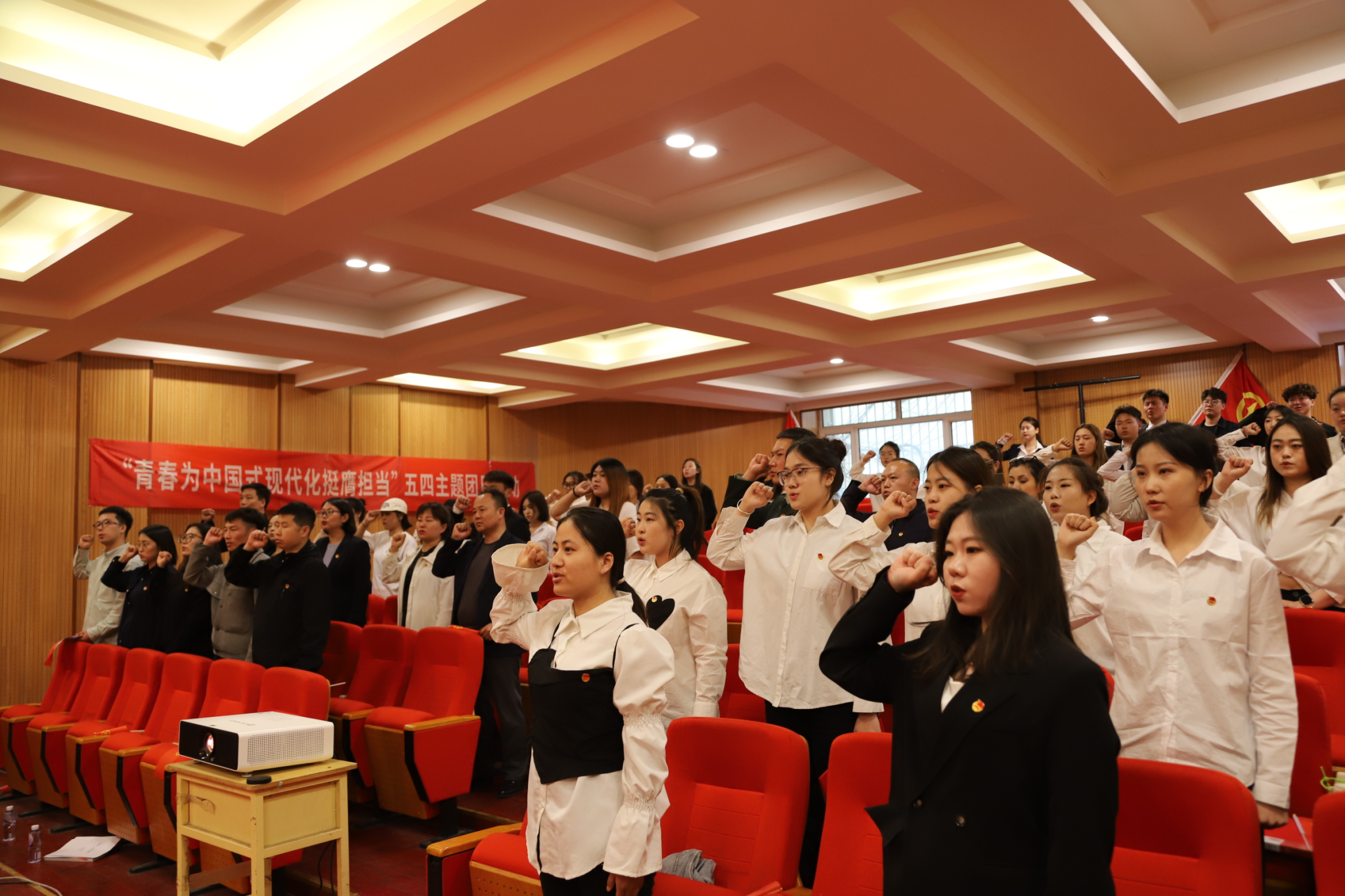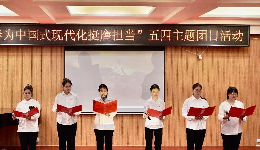 6名学生代表进行“五四青年”主题演讲,表达了自己传承五四精神、投身强国建设的意志和决心。在团支书刘仁杰同学的带领下,全体团员青年面向团旗重温入团誓词,庄严宣誓听党话、跟党走的坚定信念。